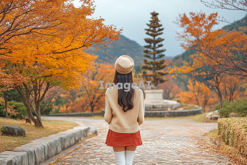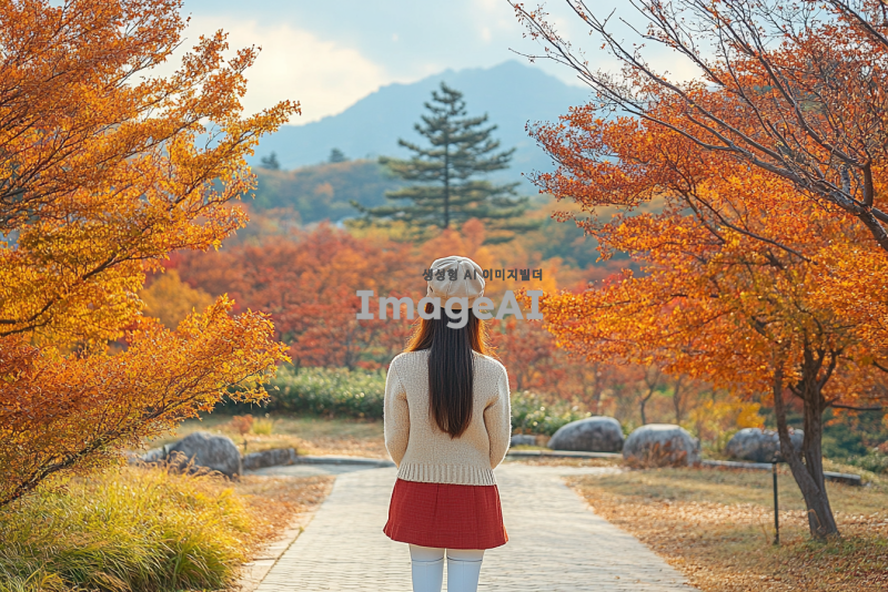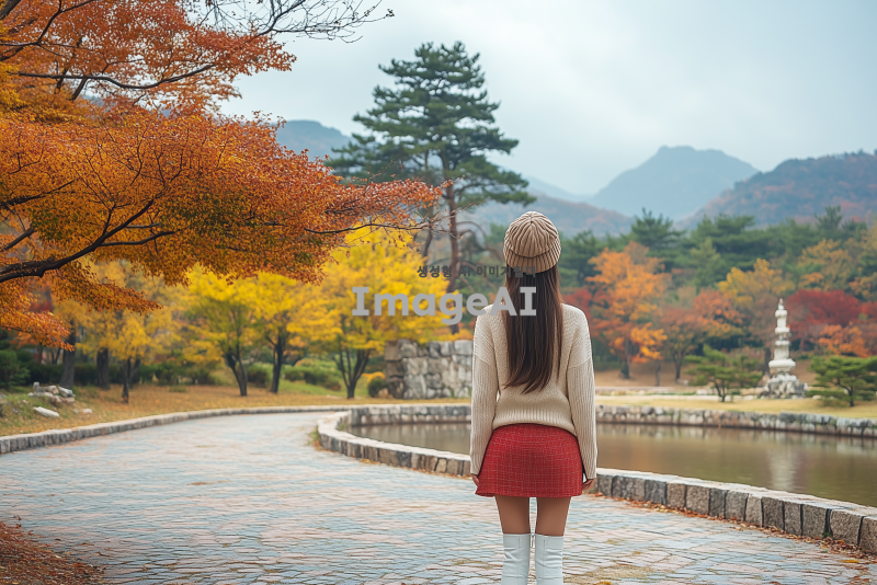 긴 생머리, 머리에 베이지색 베레모, 흰색 가디건, 빨간 미니스커트, 흰색 부츠를 신고 있는 아름다운 20대 한국 여성의 뒷모습, 가을 배경