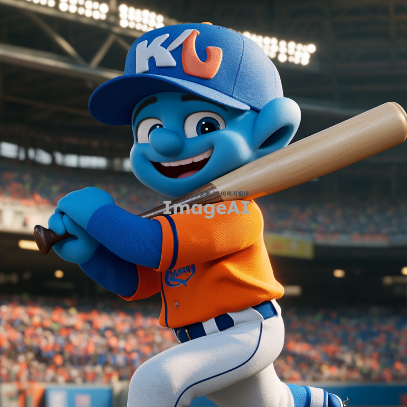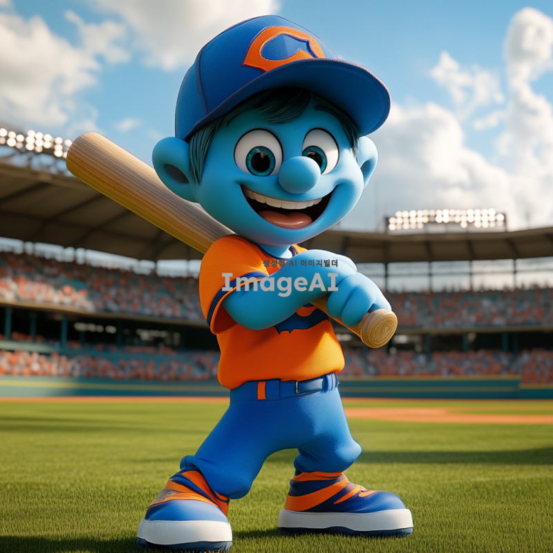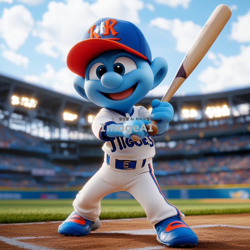 스머프 캐릭터가 기아타이거즈의 야구 유니폼을 입고 있는 모습, 밝고 생동감 있는 색상, 배경은 야구 경기장, 스머프는 웃고 있으며 손에 야구 방망이를 들고 있음.