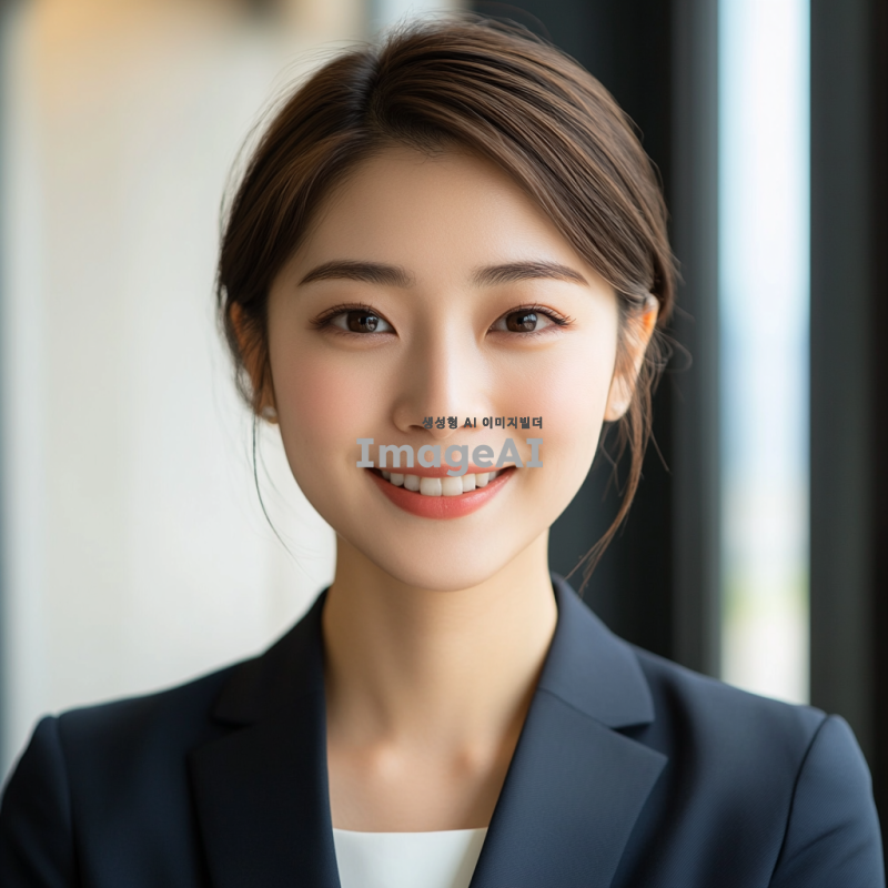 30대 여성 직장인의 증명사진, 신뢰감 있고 밝은 느낌, 단정한 정장 차림, 자연스러운 미소, 깔끔한 배경, 부드러운 조명, 세련된 헤어스타일, 자연스러운 메이크업.
