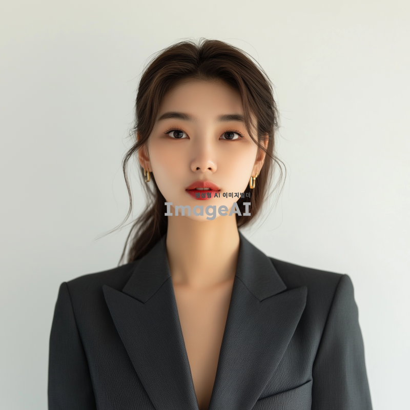 20대 중반 한국인 여성 직장인의 증명사진, 밝고 신뢰감 있는 표정, 깔끔한 정장 차림, 자연스러운 메이크업, 단정한 헤어스타일, 흰색 배경, 부드러운 조명.