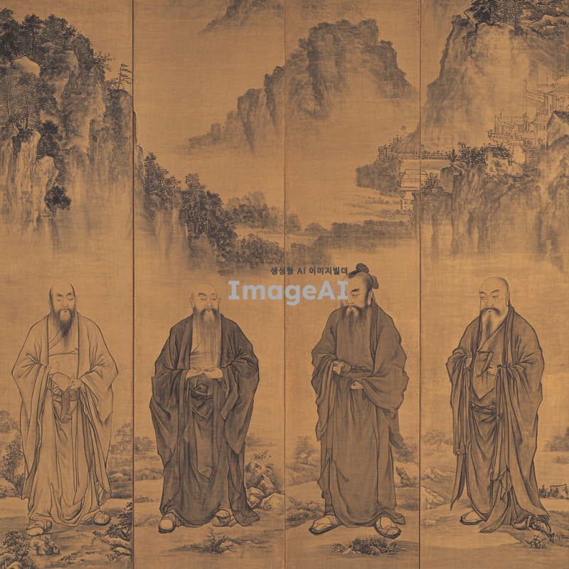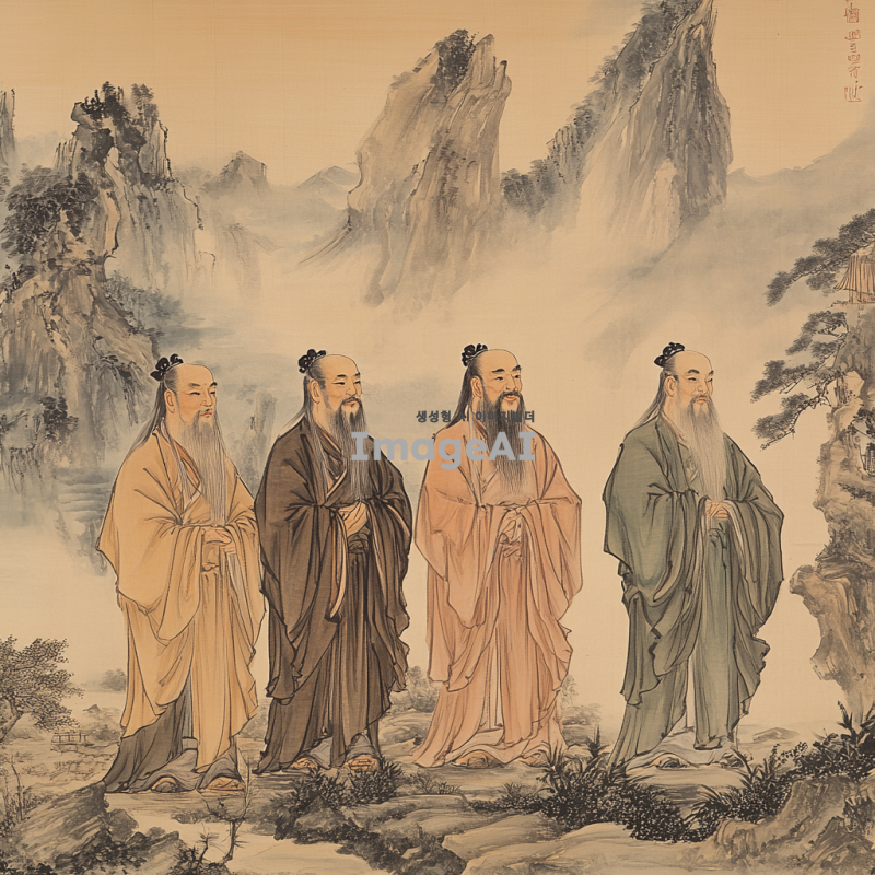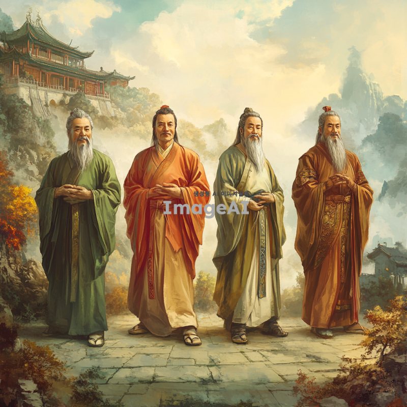 전통적인 동양의 사상과 철학을 반영한 이미지. 고대 중국의 풍경 속에서 네 명의 현자가 각기 다른 상징적인 자세와 표정으로 서 있는 장면. 첫 번째 현자는 인(仁)을 상징하며, 자비로운 미소와 따뜻한 눈빛을 가진 모습. 두 번째 현자는 의(義)를 상징하며, 결단력 있는 눈빛과 단호한 자세로 서 있는 모습. 세 번째 현자는 예(禮)를 상징하며, 품위 있는 자세와 정중한 표정으로 서 있는 모습. 네 번째 현자는 지(智)를 상징하며, 깊은 통찰력을 가진 눈빛과 차분한 자세로 서 있는 모습. 배경은 고대 중국의 자연경관과 전통 건축물들이 어우러져 있는 장면. 조화롭고 평화로운 분위기.