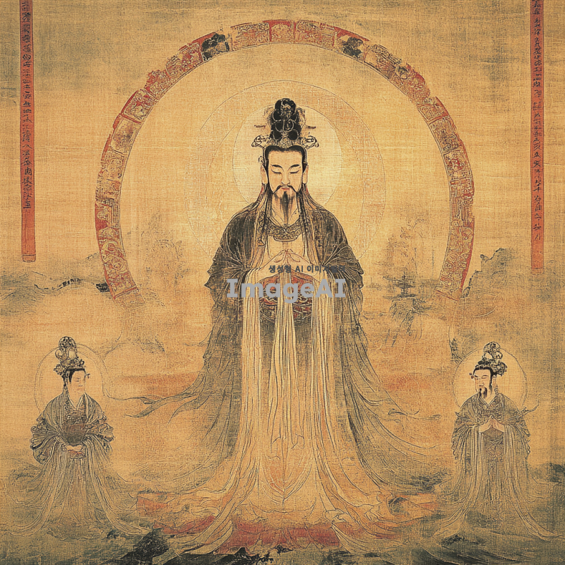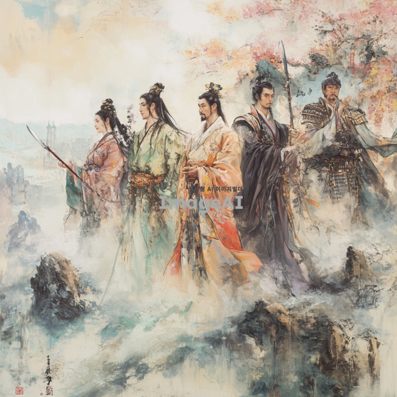 고대 중국의 철학적 개념인 인의예지신을 시각적으로 표현한 그림. 각 단어를 상징하는 요소들이 조화를 이루며, 전통적인 동양 예술 스타일로 표현됨. 인(仁)은 따뜻하고 포용적인 느낌의 인물, 의(義)는 정의롭고 강직한 전사, 예(禮)는 우아한 예법을 지키는 인물, 지(智)는 지혜롭고 사려 깊은 현자, 신(信)은 신뢰와 충실함을 나타내는 인물로 묘사됨. 배경은 고대 중국의 전통적인 풍경으로, 각 인물들이 자연스럽게 어우러져 있는 장면. 색감은 차분하고 조화롭게, 세밀한 붓질로 디테일을 살림.