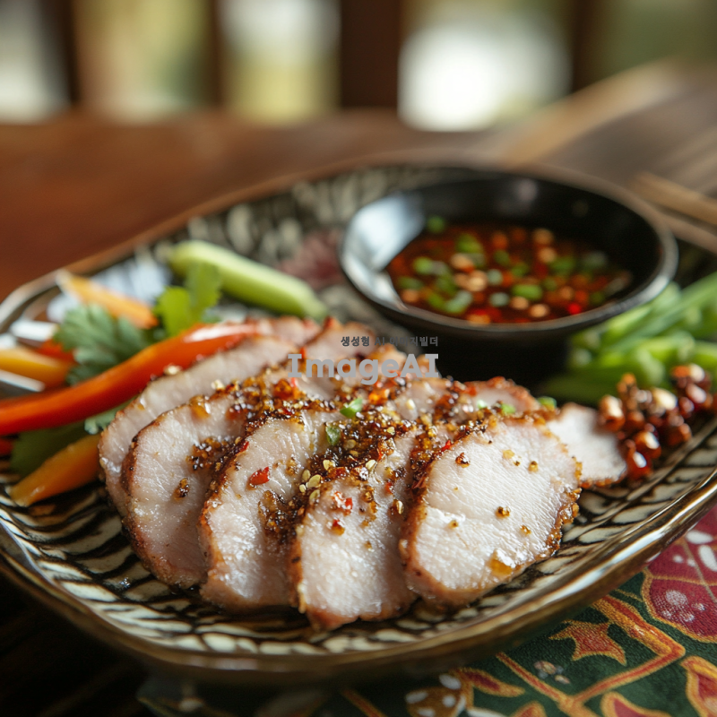 전통 중국 요리인 오향장육을 테이블 위에 정갈하게 놓인 모습으로, 돼지고기를 오향장육 방식으로 조리하여 얇게 썬 후 접시에 담긴 상태로 표현. 고기 위에는 향긋한 오향의 향신료가 뿌려져 있으며, 옆에는 신선한 채소와 함께 고소한 소스가 담긴 작은 그릇이 놓여 있음. 배경은 따뜻한 조명의 아늑한 식당 분위기, 중국 전통 문양이 새겨진 식탁보가 식탁을 덮고 있는 장면.
