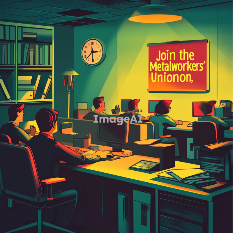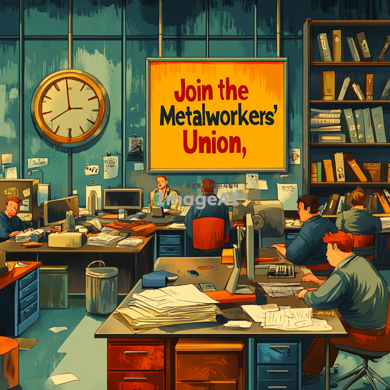 풍자적인 일러스트 스타일, 사무실 배경, 피곤한 표정의 직장인들이 책상에 앉아 있는 모습, 책상 위에는 서류 더미와 컴퓨터, 벽에는 시계가 걸려 있으며 시간이 느리게 가는 듯한 느낌, 한쪽 구석에는 금속노조 가입을 독려하는 포스터가 붙어 있음, 포스터에는 생생한 색상과 강렬한 글씨체로 "금속노조 가입" 문구, 전체적으로 약간의 유머와 풍자가 느껴지는 분위기.