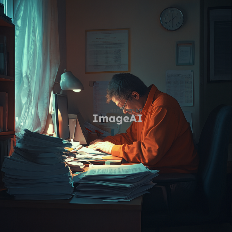 장시간 노동에 지친 사람이 책상에 앉아 있는 모습, 희미한 조명 아래에서 피곤한 표정을 짓고 있음. 주변에 쌓인 서류와 컴퓨터 화면에 빛이 반사되어 피곤함을 강조. 작은 창문으로 들어오는 약간의 햇빛이 방 안을 비추고, 시계는 늦은 시간을 가리키고 있음.