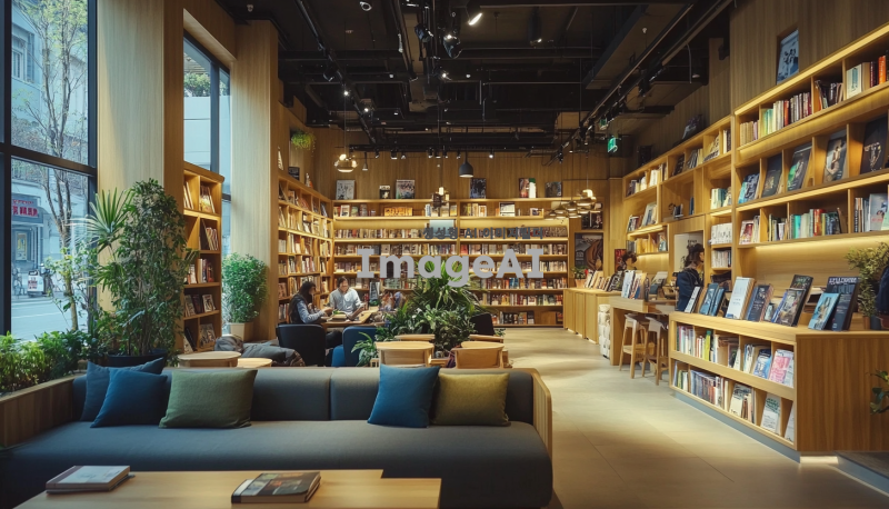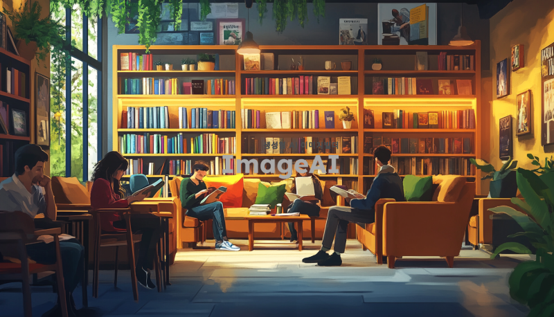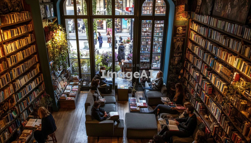 아늑하고 따뜻한 분위기의 책방, 나무 책장이 가득한 실내, 편안한 소파와 안락의자, 부드러운 조명 아래 다양한 장르의 책들이 진열된 모습, 창문을 통해 들어오는 자연광, 독서에 몰두하는 사람들, 차와 커피를 즐길 수 있는 작은 카페 코너, 벽에는 예술적인 포스터와 식물들이 장식된 장면.