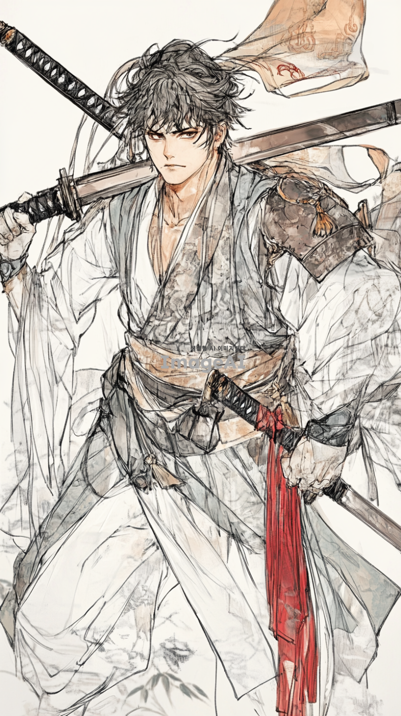 중국 전통 의상을 입고 있는 무사, 등에 검, 도, 창, 봉과 같은 다양한 무기를 메고 있는 모습, 복잡한 자수와 디테일이 돋보이는 옷차림, 전통적인 중국 배경, 강렬하고 결의에 찬 표정, 동양적인 미적 요소가 강조된 이미지, 역사적이고 문화적인 분위기.