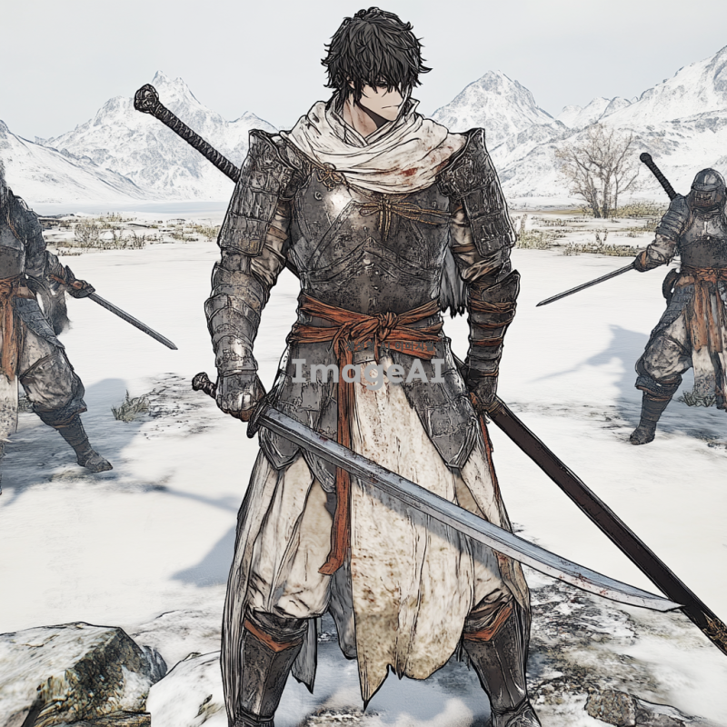참조 이미지 거의 그대로 등에 창, 도, 봉 등을 메고 있는 걸로만 변경