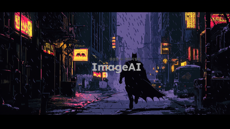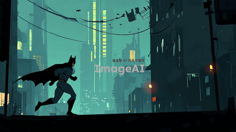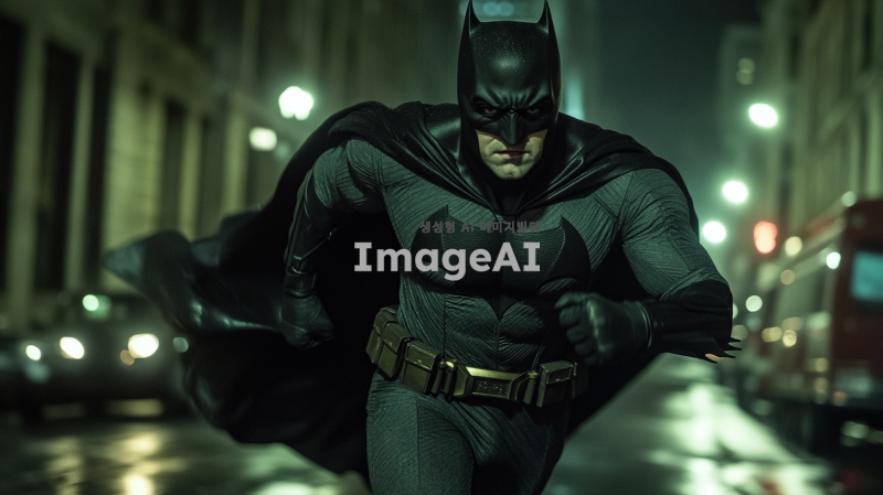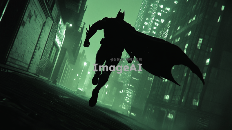 어두운 고담시의 밤거리, 배트맨이 그림자처럼 빠르게 달리는 모습, 도시의 네온 불빛이 희미하게 비치는 배경, 배트맨의 검은 망토가 바람에 휘날리는 장면, 긴장감 넘치는 액션과 신비로운 분위기, DC 코믹스 스타일의 예술적 표현, 날카로운 눈빛과 강인한 모습, 고층 빌딩과 좁은 골목길이 어우러진 도시 풍경.