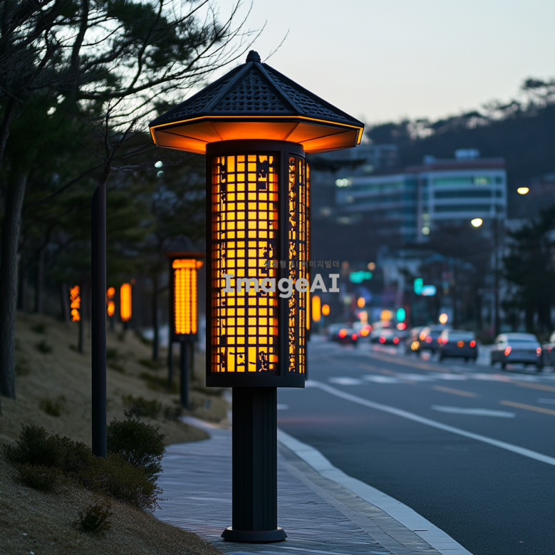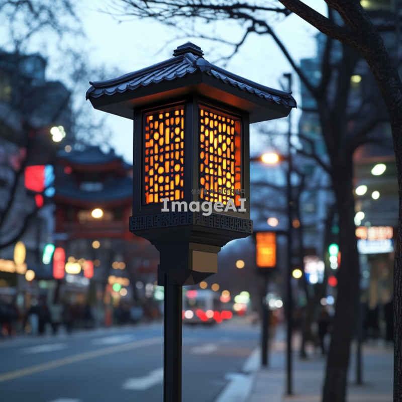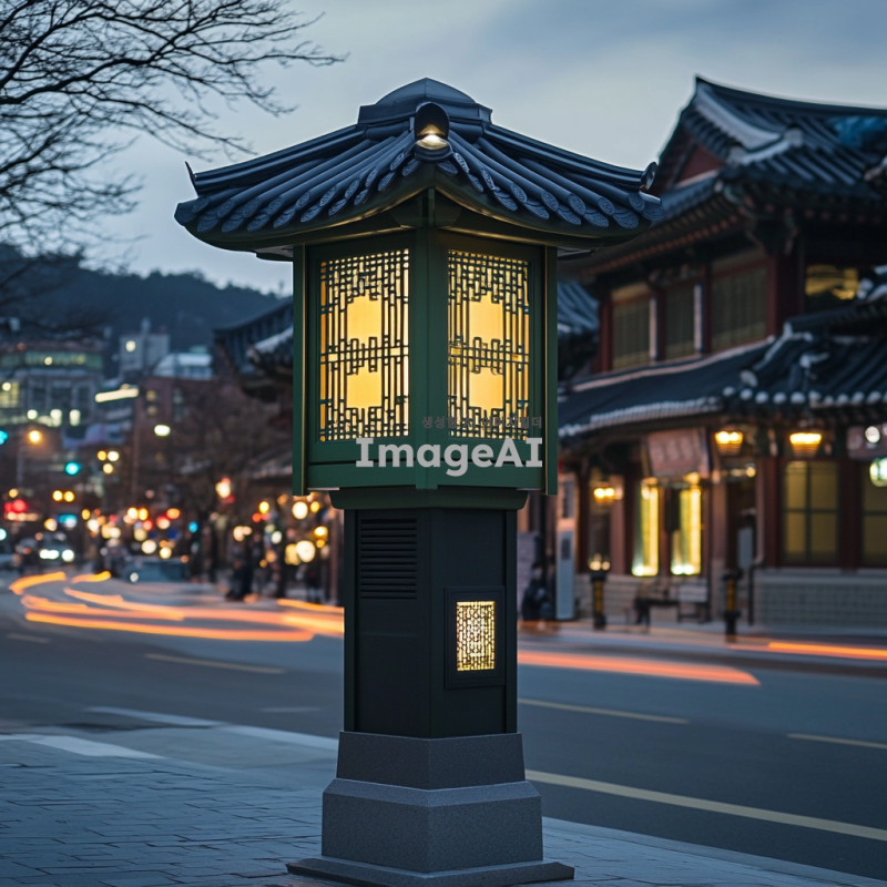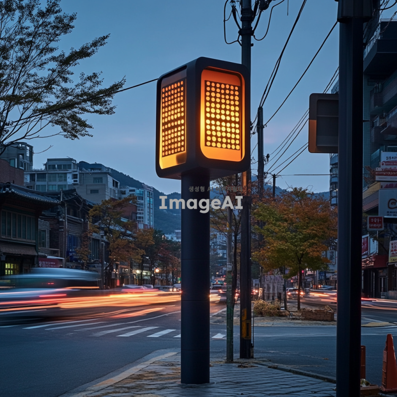 청사초롱 형태의 보행자 신호등, 전통적인 한국 청사초롱의 색상과 질감을 반영하여 디자인, 현대적인 도시 환경과 조화롭게 어우러지는 모습, 낮과 밤의 다양한 조명 효과, 보행자 안전을 강조하는 세부 요소, 주변에 한국 전통 건축 요소가 있는 거리 배경.