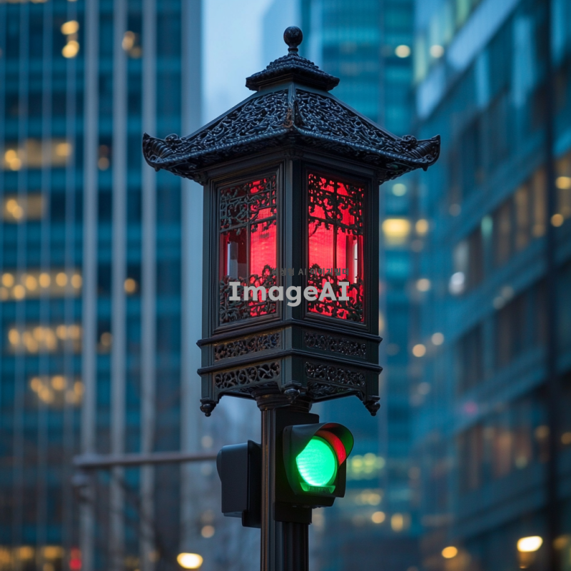전통적인 등롱 형태를 가진 보행자 신호등, 동양의 고전적인 디자인 요소를 포함하며, 붉은색과 녹색의 조명을 사용하여 행인에게 신호를 주는 모습, 정교한 세부 장식과 금속 프레임, 주변에는 현대적인 도시 풍경이 배경으로 어우러짐.