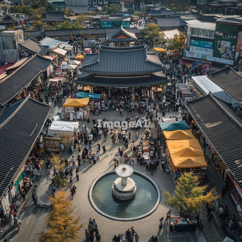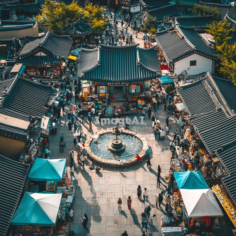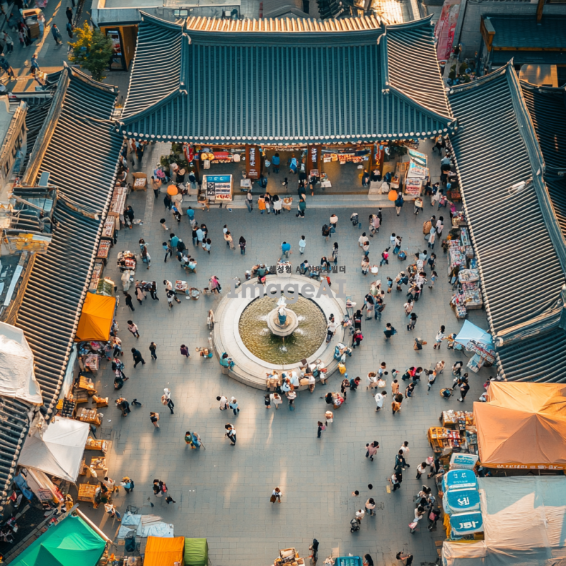 전통적인 시장과 현대적인 시장이 조화롭게 어우러진 조감도, 전통적인 시장의 요소로는 한옥 스타일의 건물과 한복을 입은 사람들이 있으며, 현대적인 시장의 요소로는 유리와 금속으로 이루어진 현대식 건물과 다양한 문화의 사람들이 어울려 있는 모습, 시장의 중앙에는 커다란 분수가 있고 그 주변으로 사람들이 모여있는 장면, 전통과 현대가 조화를 이루는 활기찬 분위기, 다양한 색상의 천막과 간판들이 어우러져 있는 모습.