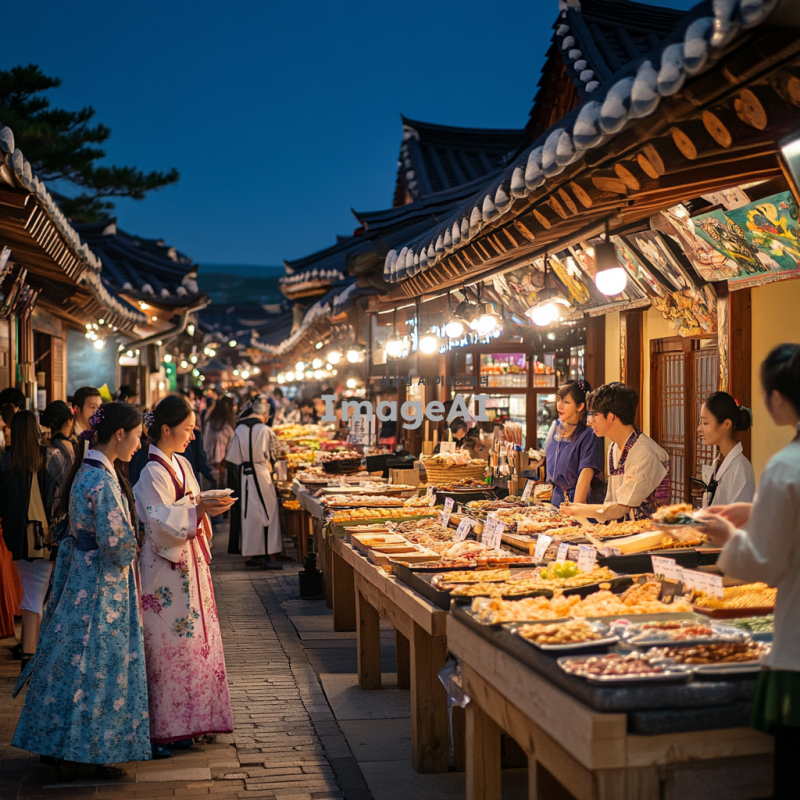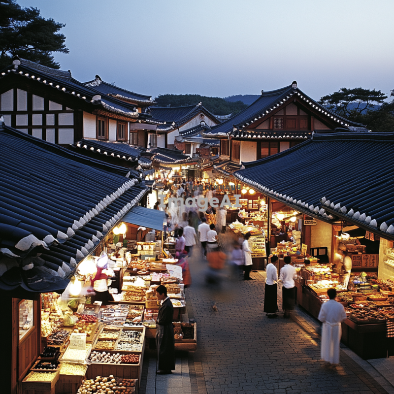 안동 시장 거리, 전통 한옥과 현대적 건물이 조화롭게 어우러진 모습, 다양한 상점과 노점상, 전통 한복을 입은 사람들과 현대적인 패션을 입은 사람들이 함께 어울리는 장면, 전통 음식과 현대 음식이 함께 진열된 시장 풍경, 활기찬 분위기, 자연광이 비치는 거리, 한국 전통 장식과 현대적 디자인 요소가 함께 있는 시장 거리