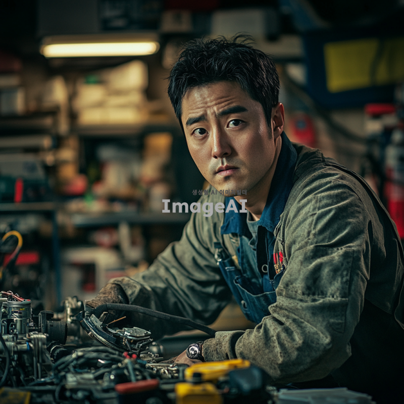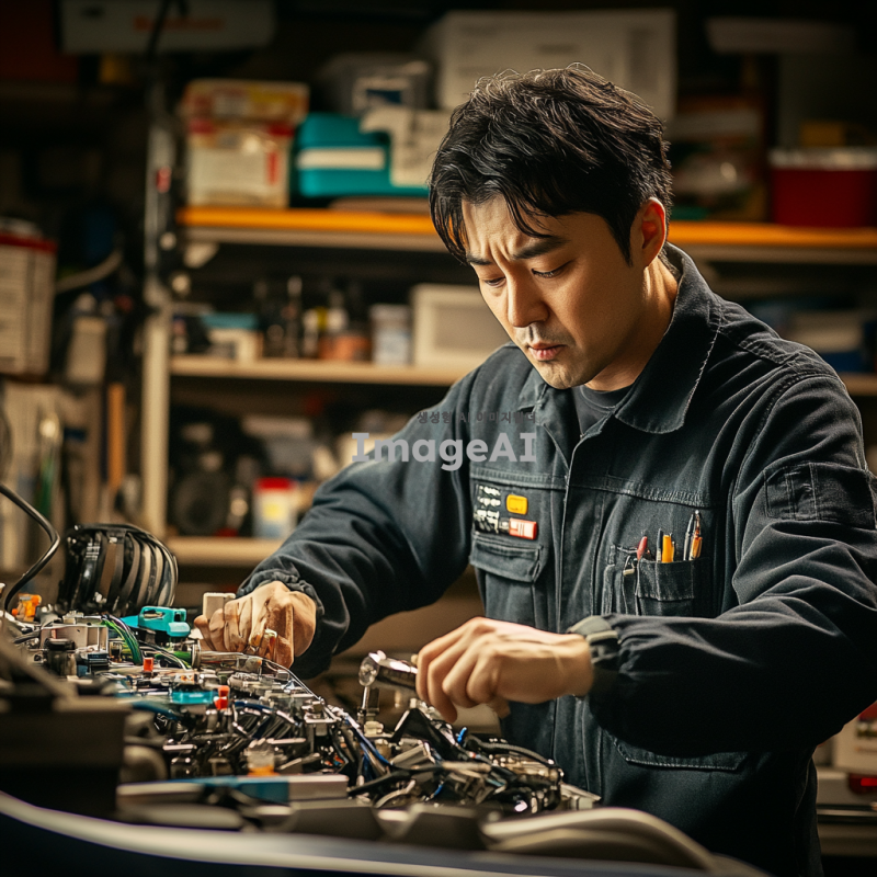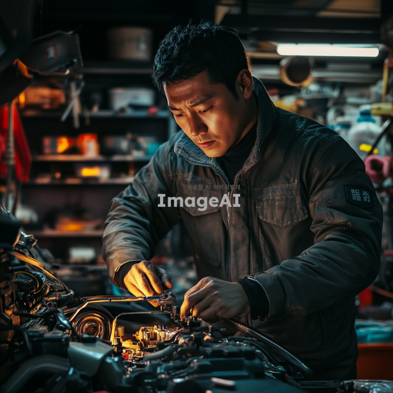 30대 한국 남자가 자동차를 개조하는 장면, 차고에서 다양한 도구와 부품들이 주변에 놓여 있고, 남자는 작업복을 입고 열정적으로 자동차 엔진을 조정하고 있는 모습, 현대적이고 세련된 자동차 디자인, 집중하는 표정, 자동차 개조의 디테일한 요소들이 잘 드러나는 장면, 따뜻한 조명 아래에서 작업하는 분위기.