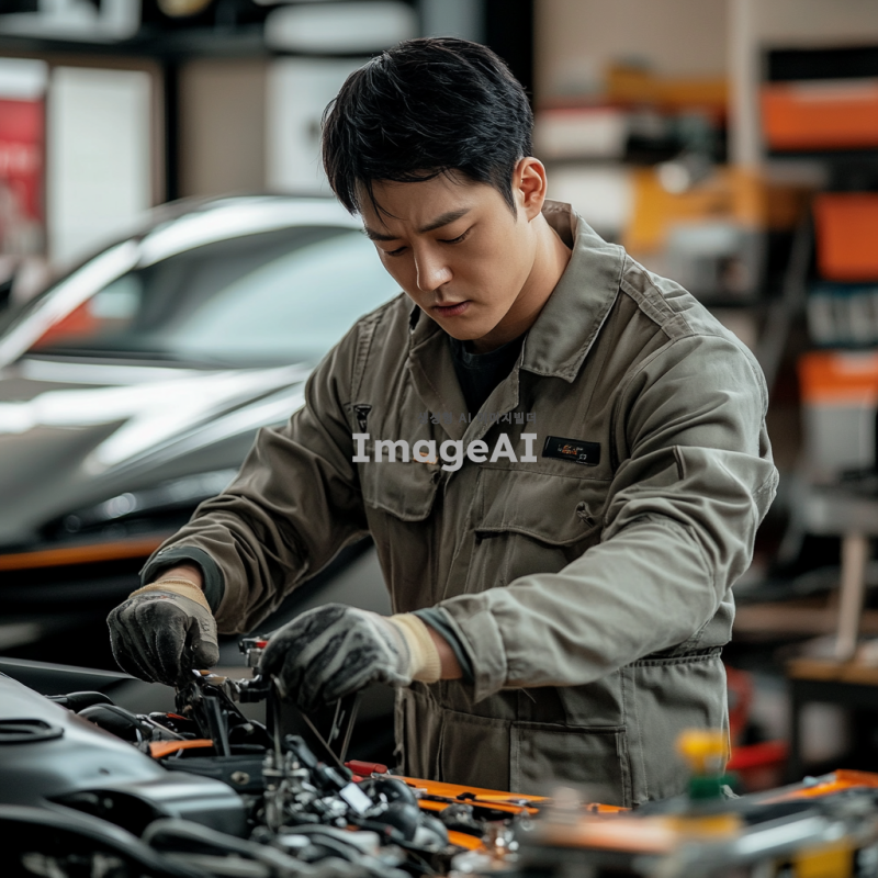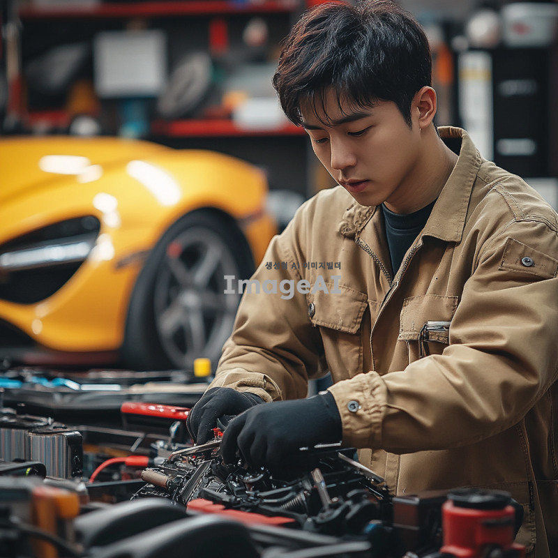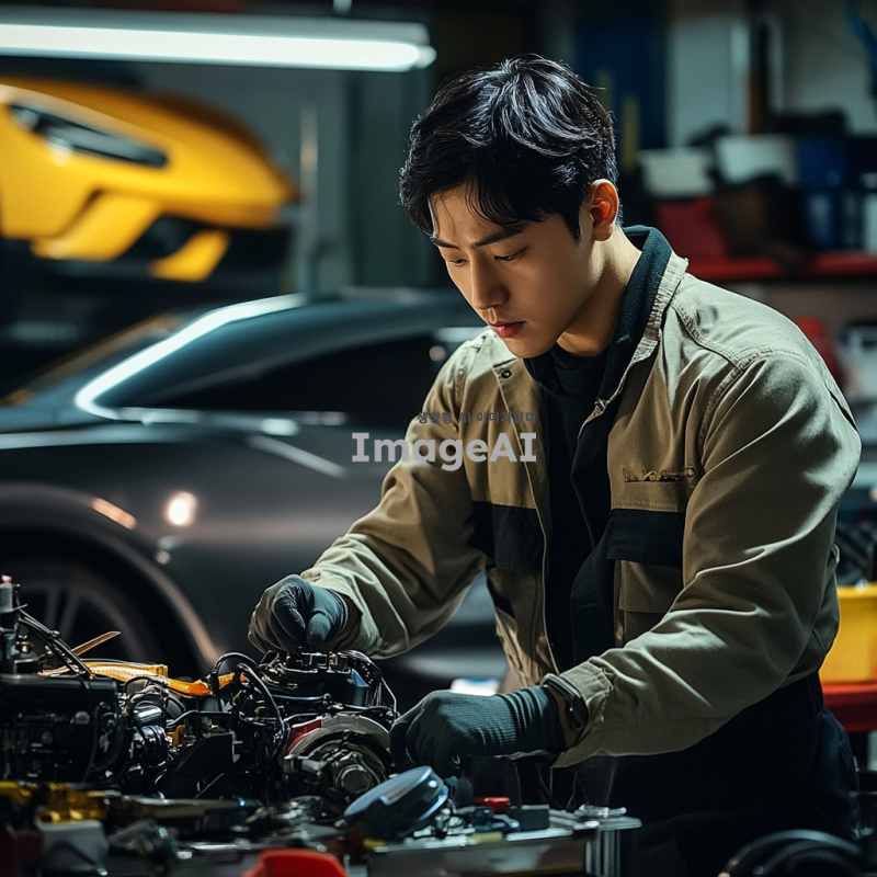 20대 한국 남자가 자동차 개조 작업을 하는 장면, 작업복을 입고 자동차 엔진을 다루는 모습, 현대적인 작업 공간, 다양한 공구와 자동차 부품이 주변에 놓여 있는 모습, 집중하여 작업하는 젊은 남자의 표정, 자동차 개조에 대한 열정이 느껴지는 분위기. 그리고 배경에 스포츠카가 보임