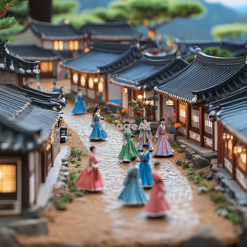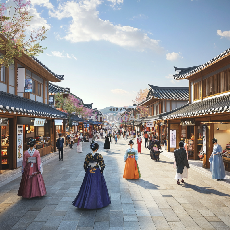 안동 시장의 메인 스트릿을 배경으로, 전통적인 건축 양식과 현대적인 디자인이 조화를 이루는 모습을 그린다. 거리에 전통놀이를 즐기는 사람들의 모습을 담고, 곳곳에 사진을 찍기 좋은 포토존을 배치한다. 시장의 활기찬 분위기와 다양한 상점들이 늘어서 있는 모습을 표현하고, 전통적인 한복을 입은 사람들이 현대적인 건물 앞에서 전통놀이를 하는 장면을 포함한다. 포토존은 전통적인 장식 요소와 현대적인 디자인이 어우러진 형태로, 방문객들이 사진을 찍으며 즐길 수 있는 공간으로 설정한다.