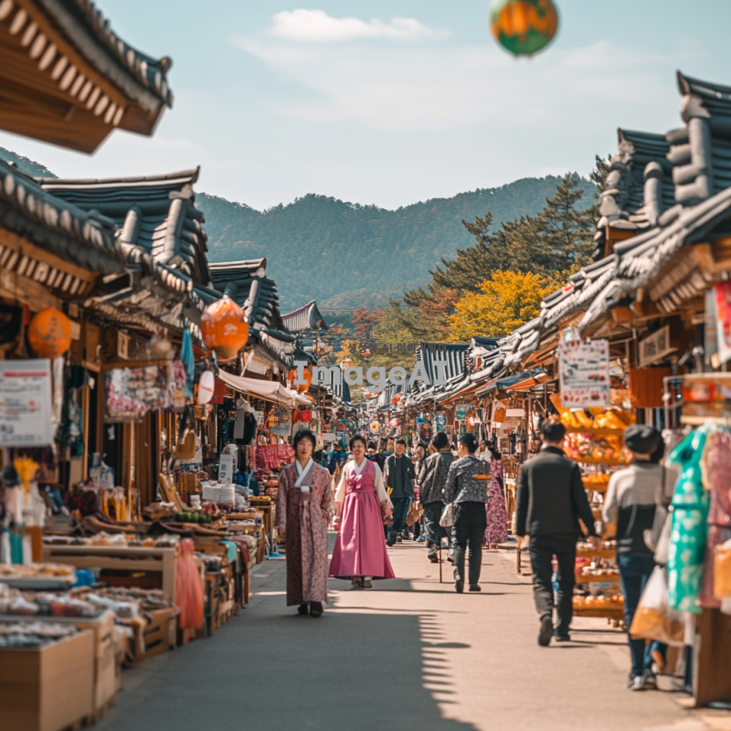 안동시장의 메인스트릿, 전통 한옥 양식의 건물과 현대적인 건축물이 어우러진 거리, 거리 양옆으로는 다양한 상점들이 늘어서 있고, 전통 한복을 입은 사람들이 거리를 거닐고 있는 모습, 거리 한쪽에는 바베큐 존이 마련되어 있어 사람들이 맛있는 음식을 즐기고 있는 장면, 전통과 현대가 조화를 이루는 활기찬 분위기, 따뜻한 색감과 조명이 어우러진 풍경.