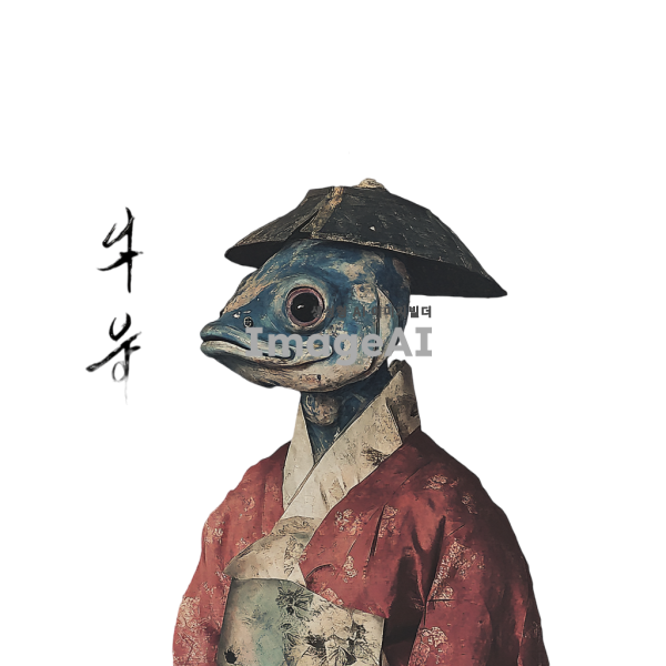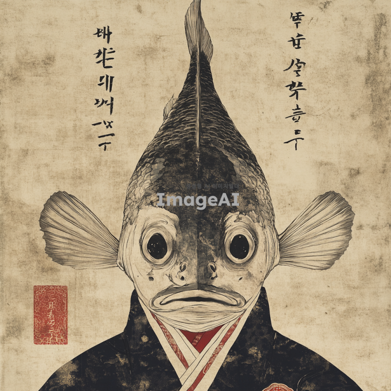 조선시대 스타일의 현상수배지, 고등어와 인간의 특징을 결합한 형상, 전통 한복을 입고 있는 모습, 고풍스러운 한지 배경, 수묵화 느낌의 세부 묘사, 얼굴은 고등어의 특징을 가지고 있으며, 몸은 인간의 형태, 조선시대의 전통적인 서체로 "현상수배"라는 문구 포함, 역사적이고 신비로운 분위기.