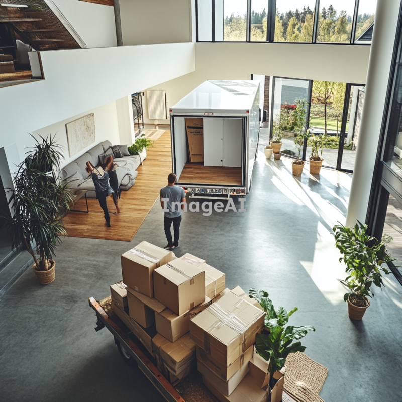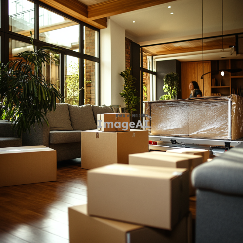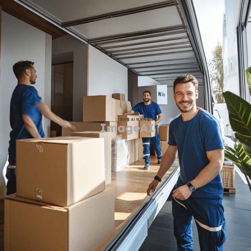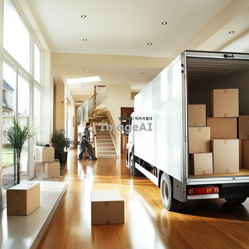밝고 활기찬 분위기의 포장이사 장면, 전문적인 이사팀이 신속하고 효율적으로 가구와 상자를 운반하는 모습, 깔끔하게 정돈된 이사 트럭, 팀원들이 협력하여 작업하는 모습, 주거지의 따뜻하고 환영하는 분위기, 다양한 크기의 상자와 가구들이 안전하게 포장되어 있는 장면, 현대적이고 세련된 주택 배경, 이사팀의 유니폼과 장비가 잘 갖추어진 모습, 고객이 만족하며 웃고 있는 표정.