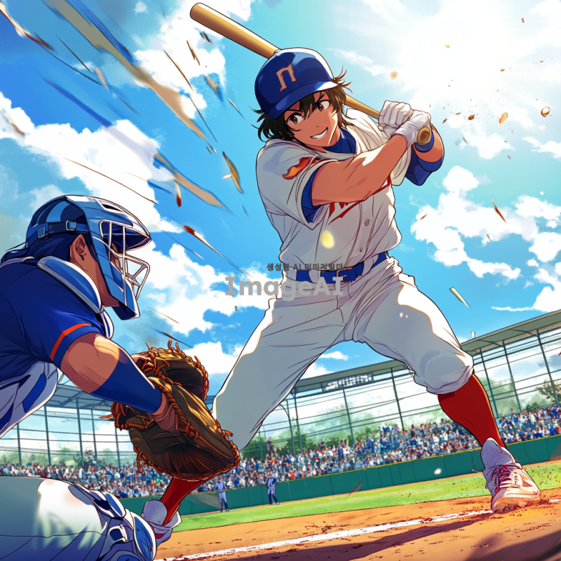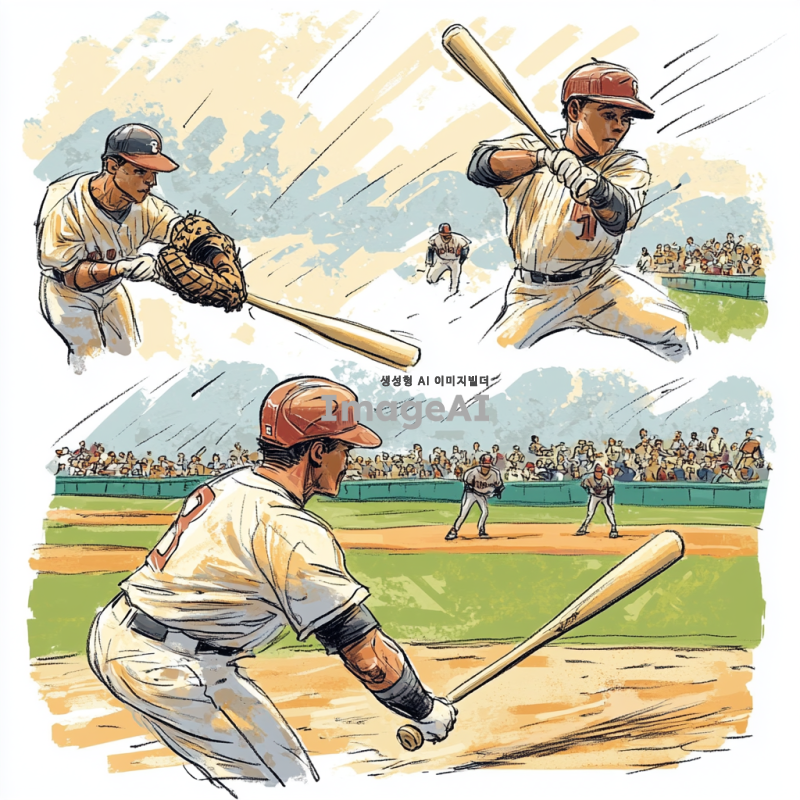 야구 경기 중인 선수들, 역동적인 동작, 빠르게 날아가는 야구공, 푸른 잔디와 흙으로 된 경기장, 관중석에 있는 사람들, 햇빛이 비치는 맑은 날씨, 팀 유니폼을 입은 선수들, 집중하는 표정, 공을 던지는 투수와 공을 치는 타자, 역동적인 움직임과 에너지 넘치는 장면.