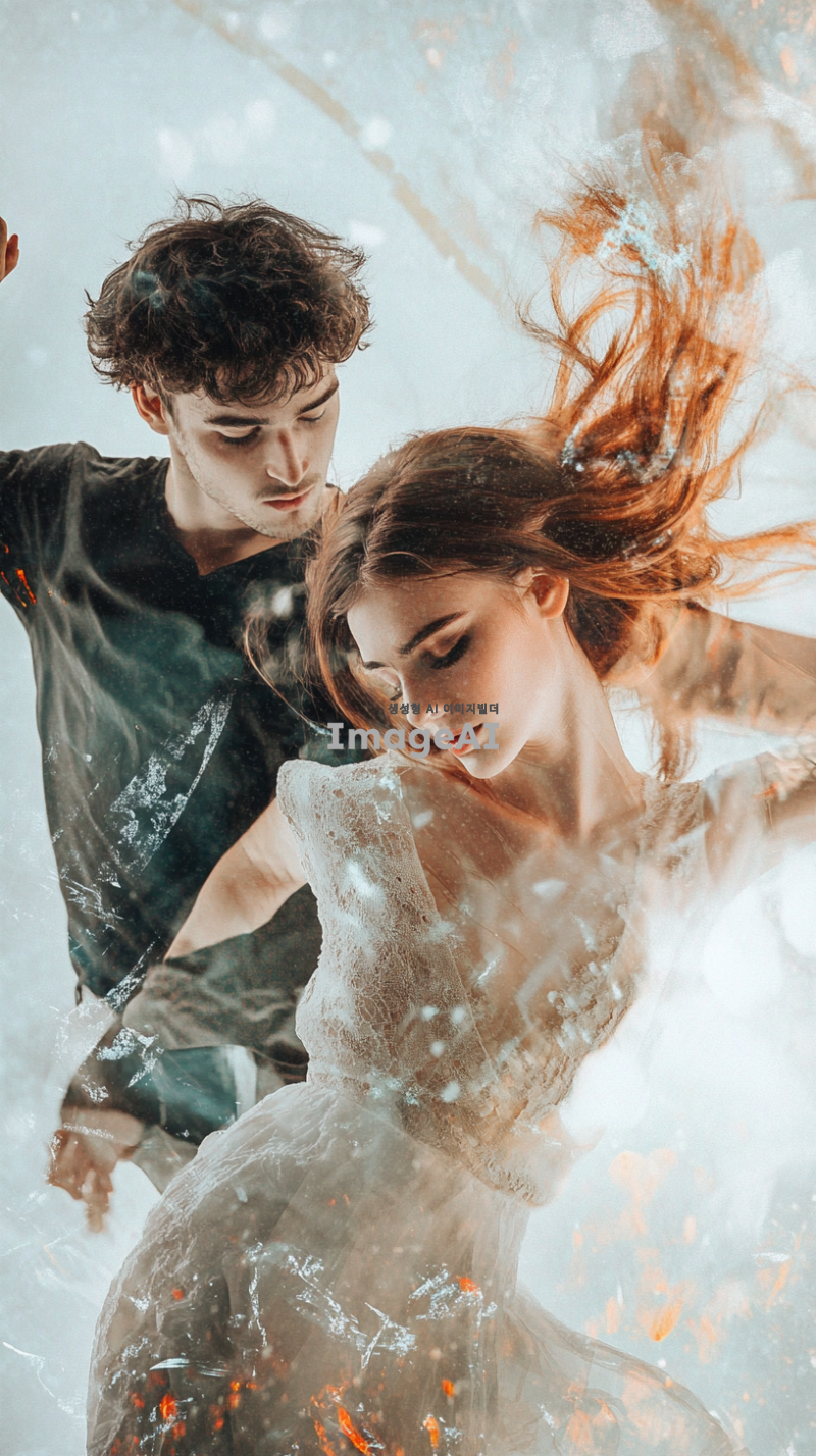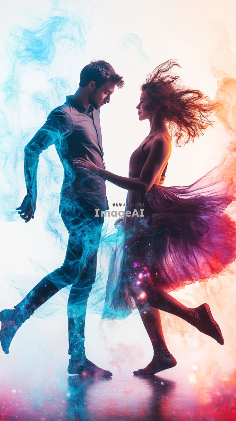젊은 남녀가 현대 무용을 추는 모습, 두 사람의 역동적인 움직임과 표정이 강조된 장면, 남자는 짧은 머리와 캐주얼한 옷차림, 여자는 긴 머리와 우아한 드레스를 입고 있으며, 배경은 투명하게 설정, 춤의 에너지가 느껴지는 생동감 있는 포즈와 조명 효과.