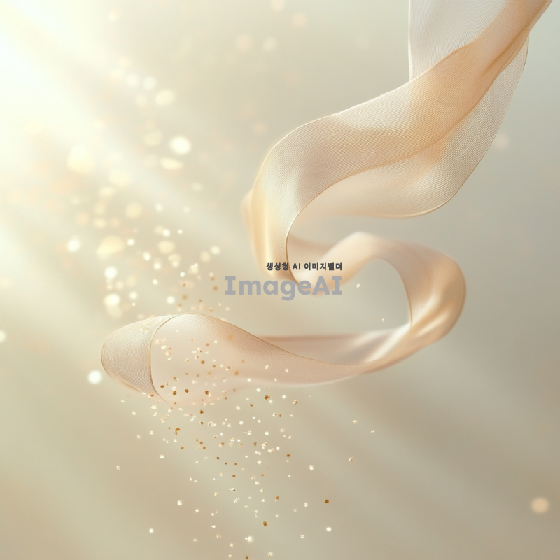 봄바람에 흩날리는 꽃가루와 함께 공중에 떠오르는 우아한 리본, 부드러운 파스텔톤 배경, 따뜻한 햇살이 비치는 장면, 리본의 섬세한 움직임과 꽃가루의 자연스러운 흐름, 평화롭고 꿈같은 분위기.