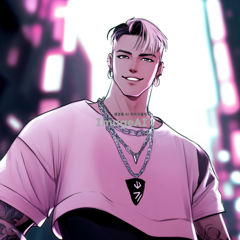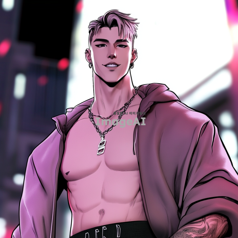 강렬한 표정과 근육질의 몸을 가진 남성 캐릭터, 짧은 헤어스타일과 날카로운 눈매, 강한 턱선과 매력적인 미소를 강조, 현대적인 스트리트 패션을 입고 있으며, 배경은 도시의 밤 풍경으로 네온사인이 빛나는 거리, 캐릭터의 자신감과 카리스마가 돋보이는 모습.