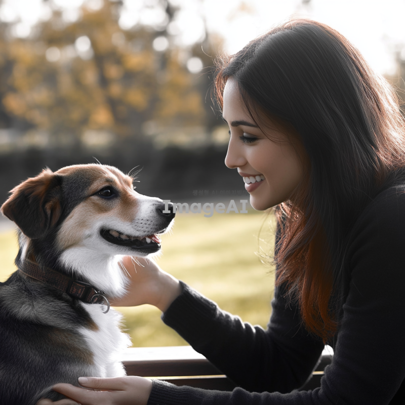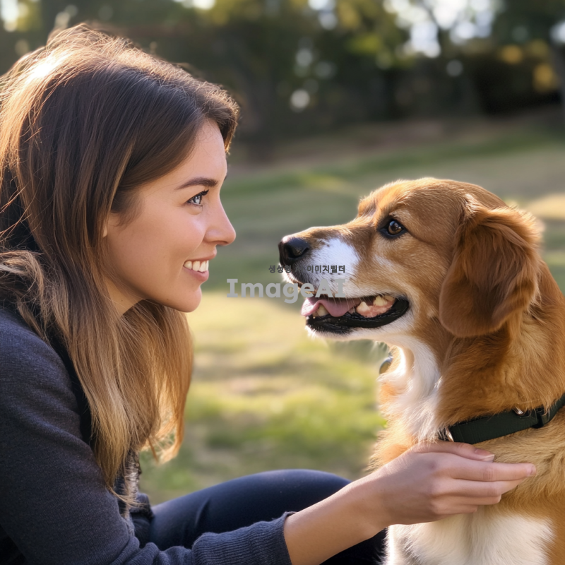 따뜻한 미소를 짓고 있는 여성과 그녀의 반려견이 서로를 바라보고 있는 장면, 여성은 긴 머리를 가지고 있으며 캐주얼한 옷차림, 반려견은 중형견으로 털이 부드럽고 눈이 반짝임, 배경은 햇살이 비치는 공원 벤치, 두 사이에 흐르는 친밀한 분위기와 사랑스러운 감정이 강조됨.