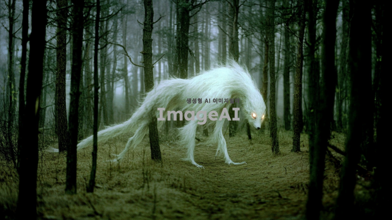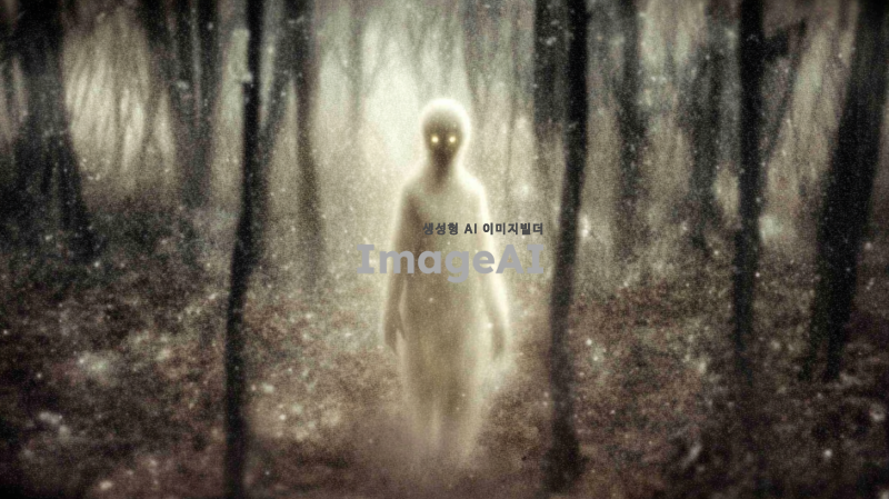 한국 전통 요괴 장산범, 어두운 숲 속에서 신비로운 분위기, 긴 흰 털과 빛나는 눈, 뒤를 돌아보는 자세, 공포스러운 얼굴,