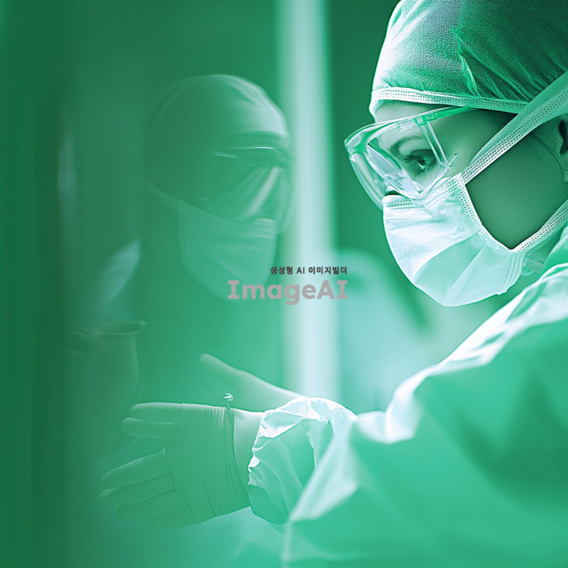 의사들이 수술실에서 집중하며 협력하는 모습, 그린 톤의 조명과 장비들이 어우러진 장면, 세밀한 수술 도구와 의료진의 섬세한 손길, 차분하고 전문적인 분위기, 의료복과 장갑의 질감, 수술실의 청결한 환경과 첨단 의료기기 배경.