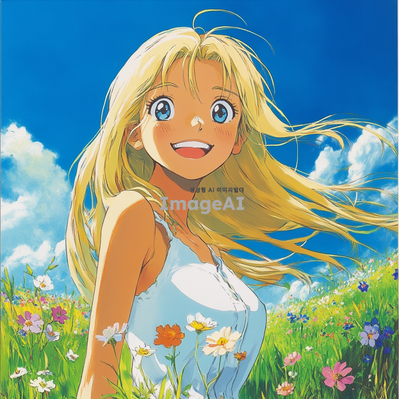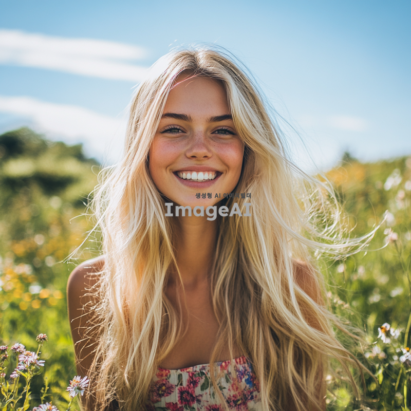 밝은 햇살 아래에서 해맑게 웃고 있는 금발의 외국 여자 아이, 자연스럽게 흩날리는 긴 머리, 푸른 하늘을 배경으로 한 초록색 들판에 서 있는 모습, 건강하고 활기찬 분위기, 따뜻한 햇빛이 아이의 얼굴을 부드럽게 비추는 장면, 아이의 눈은 반짝이고 입가에는 환한 미소, 주변에는 야생화가 살짝 피어 있는 장면.