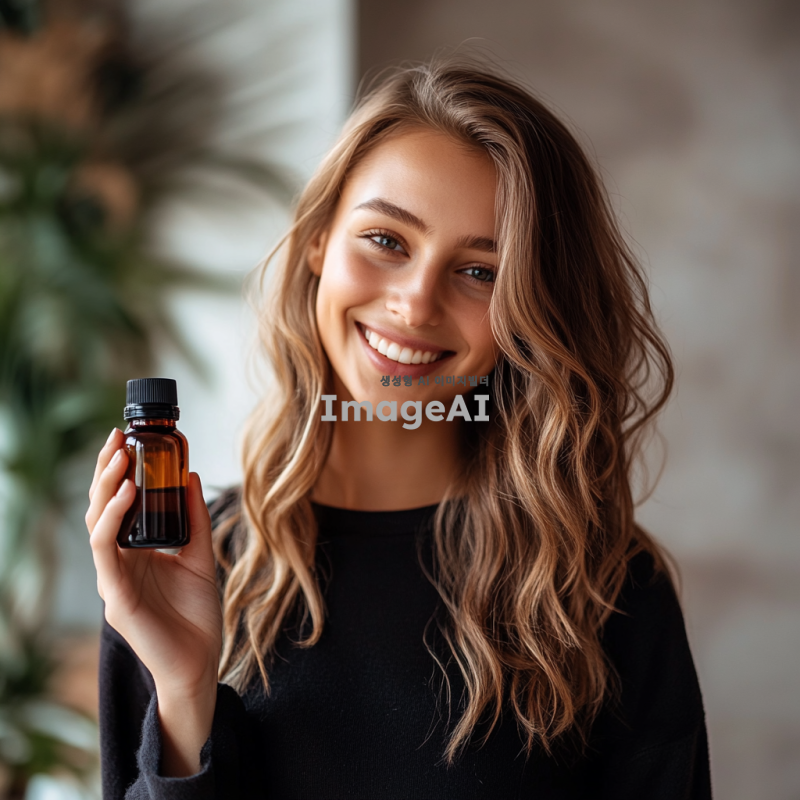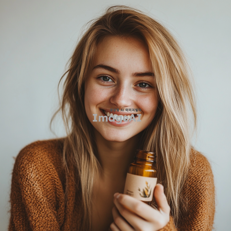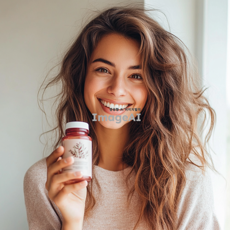 밝은 미소를 짓고 있는 젊은 외국 여성, 건강하고 활기찬 분위기, 자연광이 비치는 실내에서 촬영, 손에 영양제 병을 들고 있는 모습, 깨끗하고 깔끔한 배경, 건강과 웰빙을 연상시키는 요소들 포함, 따뜻하고 친근한 색감, 신뢰감을 주는 눈빛과 표정, 현대적이고 세련된 스타일링.