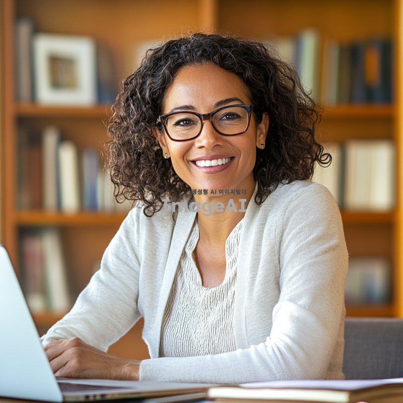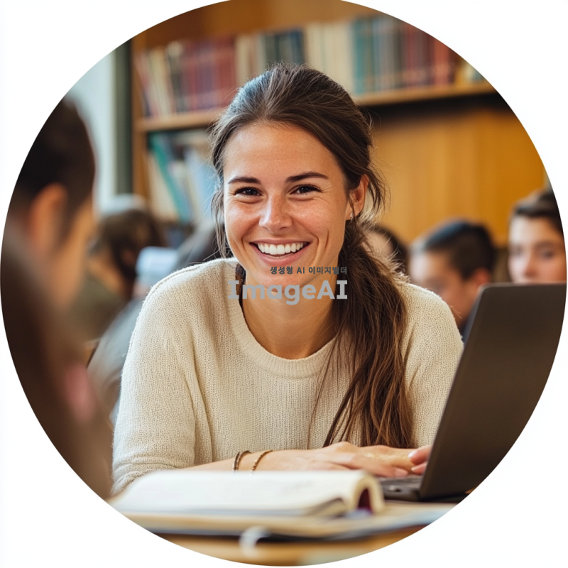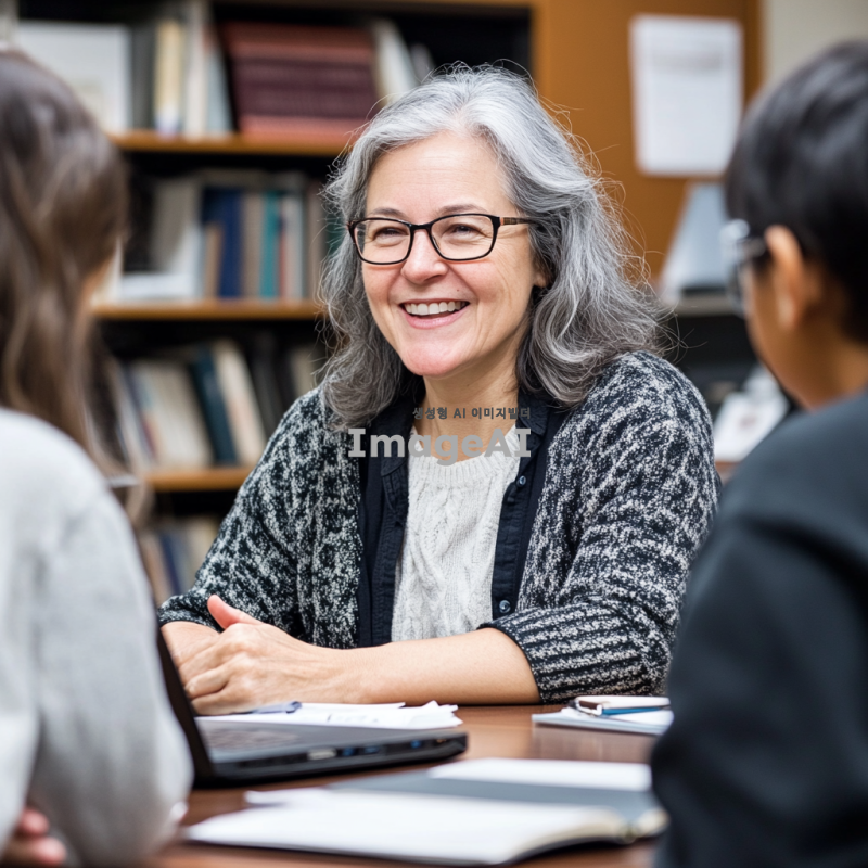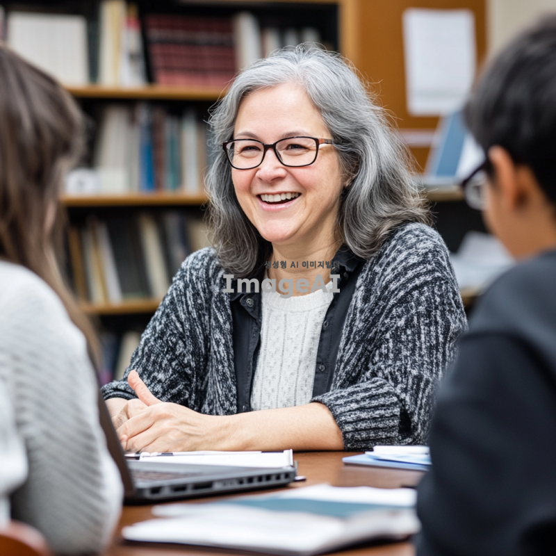 따뜻하고 인자한 미소를 짓고 있는 여성 멘토, 부드러운 눈빛과 친절한 표정을 가진 모습, 실내에서 책상에 앉아 학생들과 함께 대화하는 장면, 주변에는 책과 노트북이 놓여 있어 지식과 배움의 환경을 암시, 온화한 색조의 배경, 편안하고 격려하는 분위기, 다양한 연령대의 학생들이 함께하며 존경과 신뢰를 나타내는 장면.