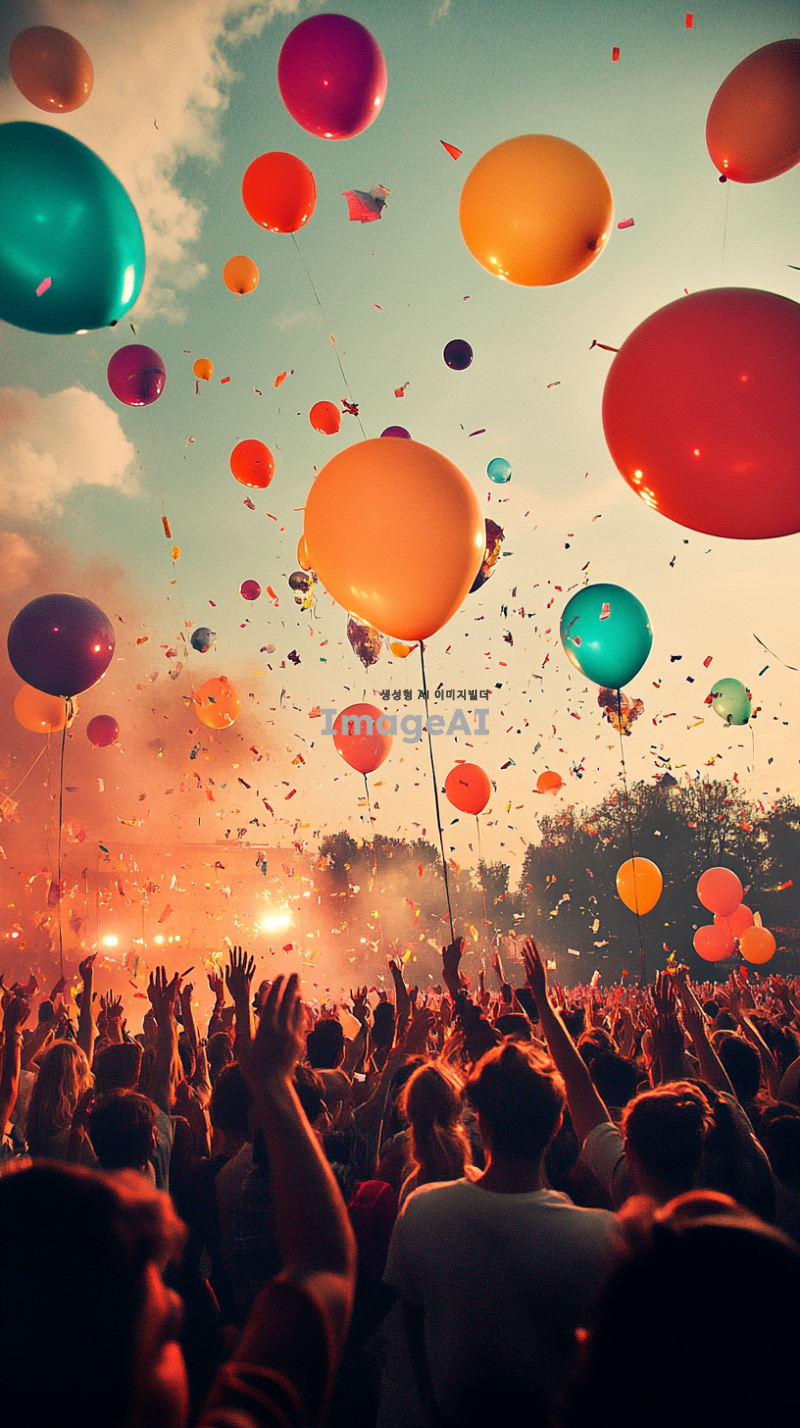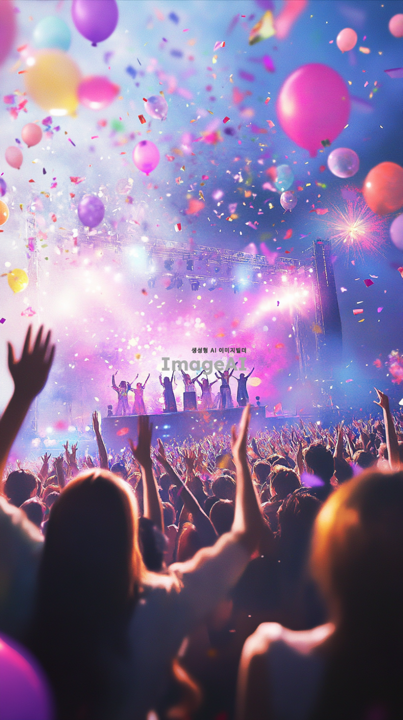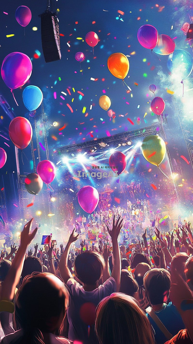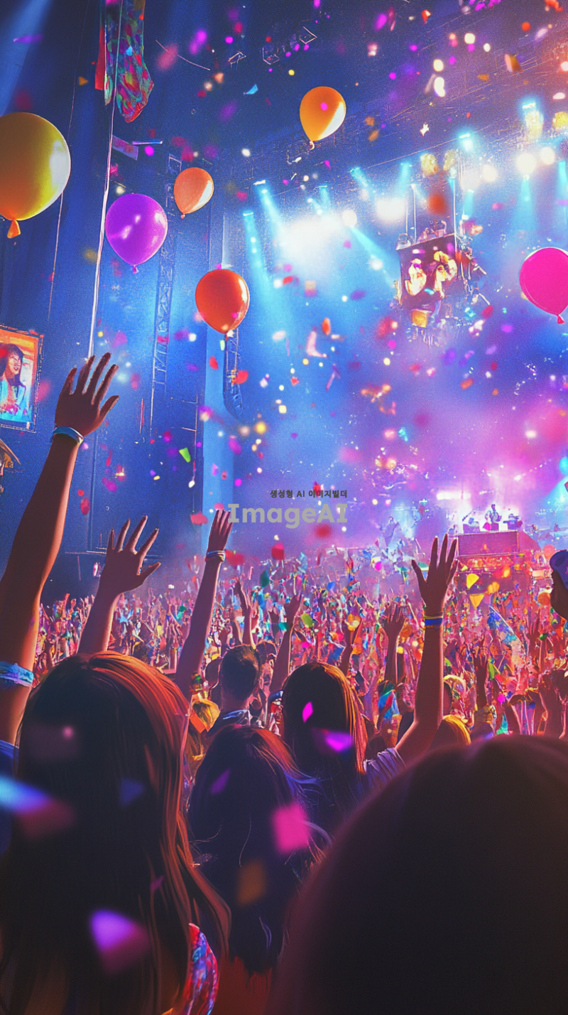 밝고 희망찬 분위기의 대규모 콘서트 장면, 다양한 연령대와 문화의 사람들이 함께 어울려 응원하는 모습, 무대 위에서 열정적으로 공연하는 가수와 화려한 조명, 관중들이 손을 흔들며 환호하는 모습, 다채로운 색상의 풍선과 깃발이 하늘을 수놓는 장면, 에너지 넘치는 음악의 리듬에 맞춰 움직이는 군중, 긍정적이고 활기찬 에너지가 가득한 장면.