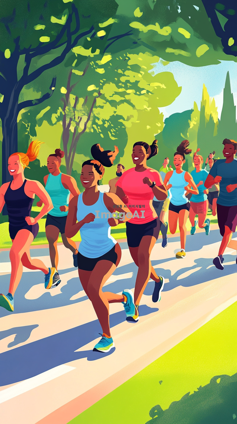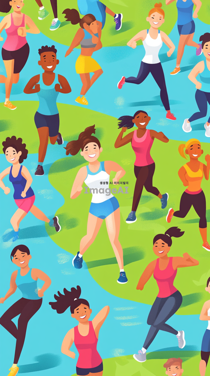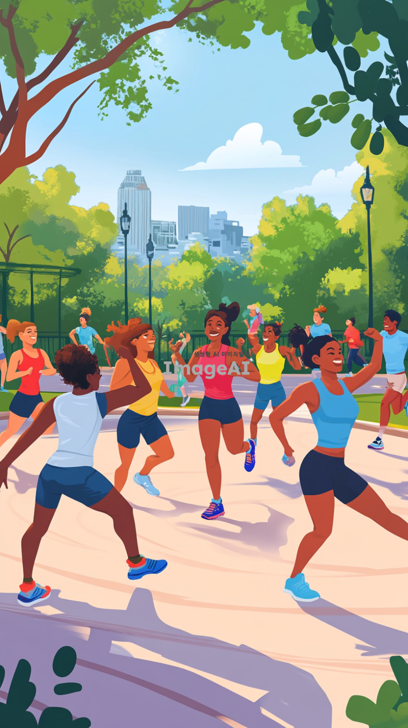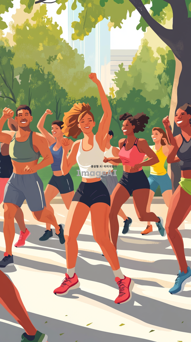 밝고 생동감 있는 운동 장면, 다양한 사람들이 함께 모여 즐겁게 운동하는 모습, 다양한 색상의 운동복과 운동화, 활기찬 에너지가 넘치는 배경, 역동적인 동작과 미소를 짓고 있는 인물들, 자연광이 비치는 실외 공간, 건강하고 활기찬 라이프스타일을 강조하는 이미지.