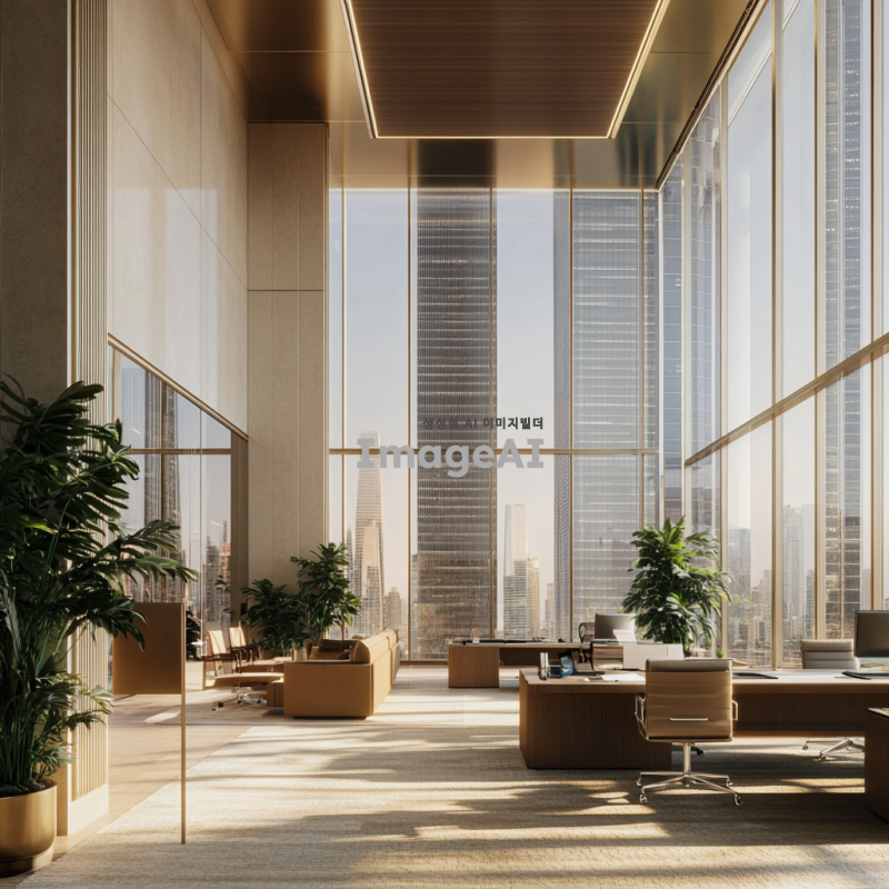현대적인 사무실 내부, 넓고 깔끔한 디자인, 고급스러운 가구 배치, 적당히 높은 층고, 큰 유리창을 통해 보이는 도시의 고층 빌딩들, 자연광이 잘 들어오는 밝은 분위기, 미니멀리즘 스타일, 따뜻한 색조의 조명, 세련된 인테리어 디테일, 깔끔하게 정리된 책상과 서류, 초록색 식물이 곳곳에 배치된 모습.