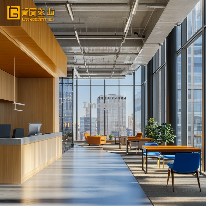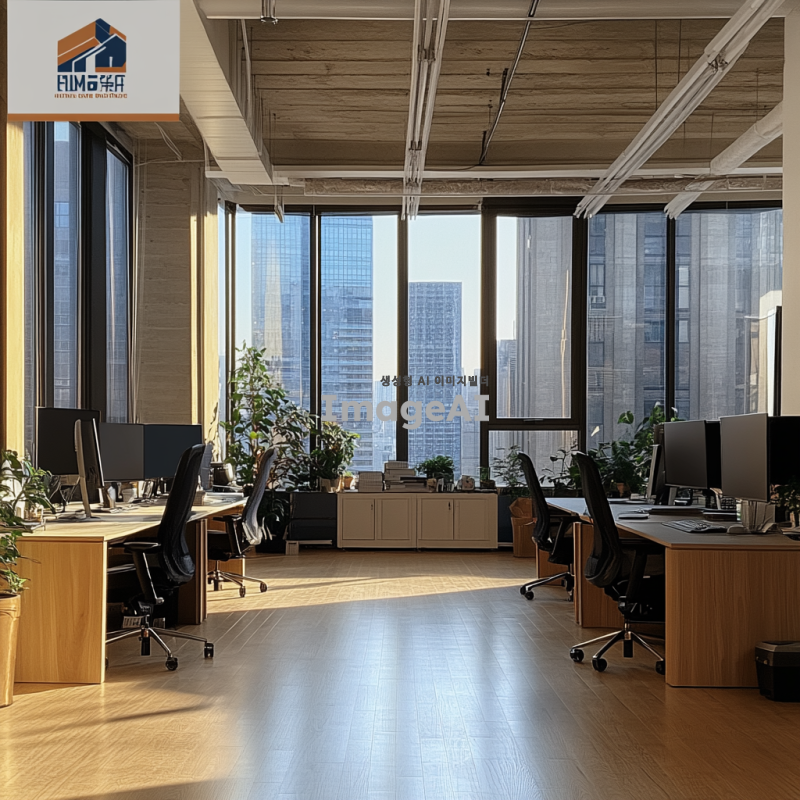 해당 이미지는 특정 사이트의 로고를 합성한 사무실 이미지다, 좌측 상단에 들어간 로고 이미지를 자연스럽게 조절해서 사무실 느낌나는 이미지를 만들어, 층고가 너무 높은대 층고는 낮춰줘