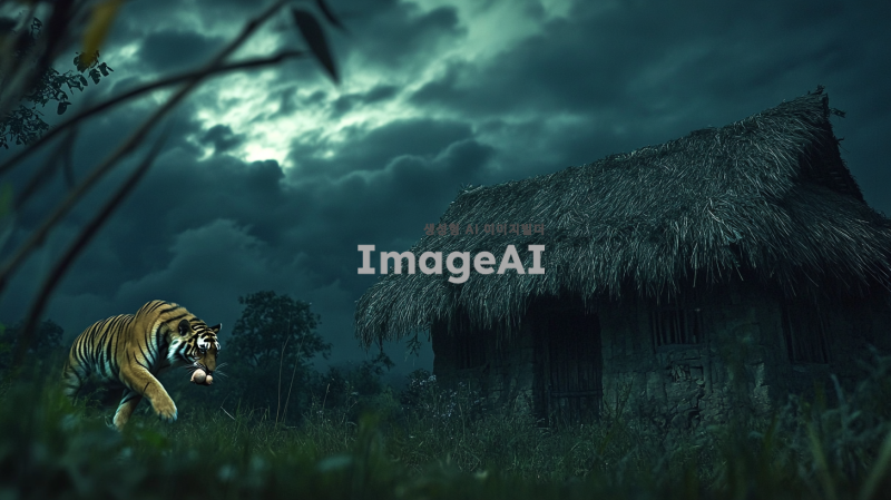 시골 초가집을 배경으로, 어두운 하늘 아래에 위치한 전통적인 초가집이 보입니다. . 화면의 왼쪽 방향으로 호랑이가 뛰어가고 있으며, 호랑이의 입에는 작은 토끼가 물려 있습니다. 호랑이는 역동적이고 빠른 움직임을 보여준다
