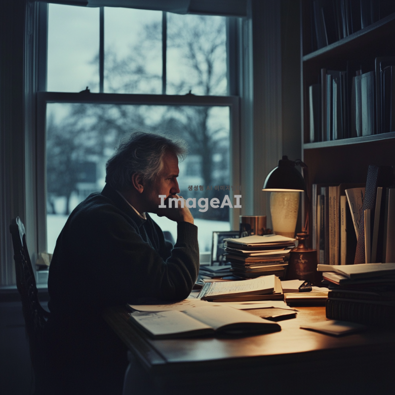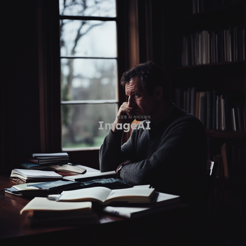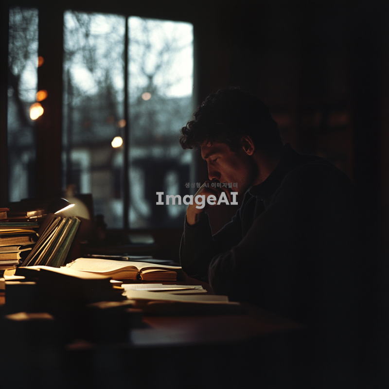 어두운 방 안에서 책상에 앉아 깊은 생각에 잠긴 남자, 창밖으로 흐린 날씨가 보이며, 방 안은 따뜻한 조명으로 은은하게 비춰지고 있다. 남자의 손은 턱을 괴고 있으며, 책상 위에는 여러 개의 책과 노트가 펼쳐져 있다. 남자의 표정은 진지하고 집중된 모습이다.