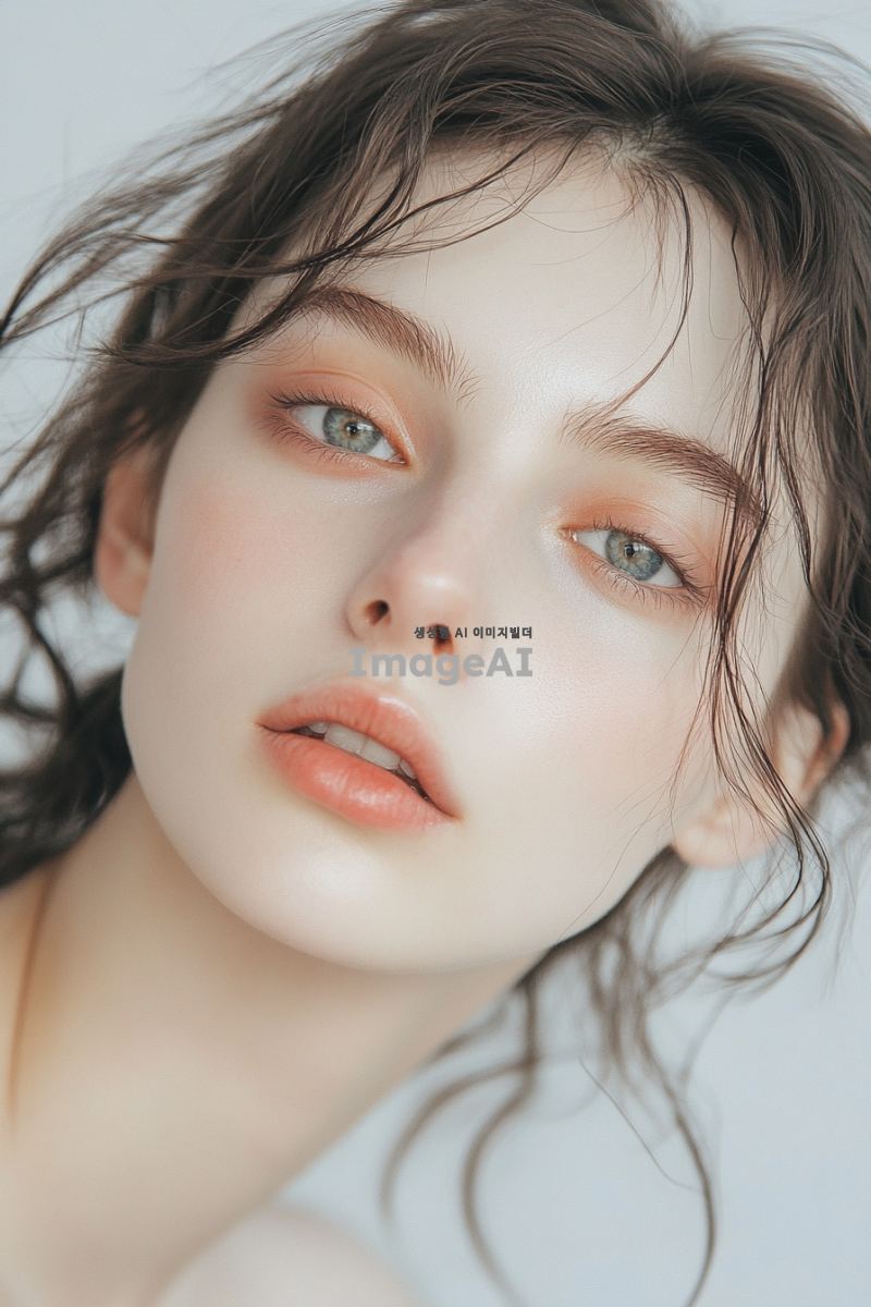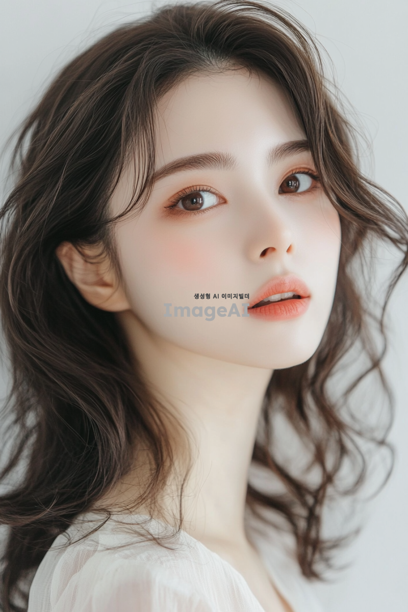 청순한 이미지의 여성 얼굴, 드뮤어 룩 스타일, 부드러운 조명, 자연스러운 메이크업, 자연스러운 웨이브, 진갈색 헤어, 깨끗하고 맑은 피부, 온화한 미소, 심플하고 우아한 의상, 화이트 배경, 핑크빛의 연한 색조 화장, 고급스러운 분위기.