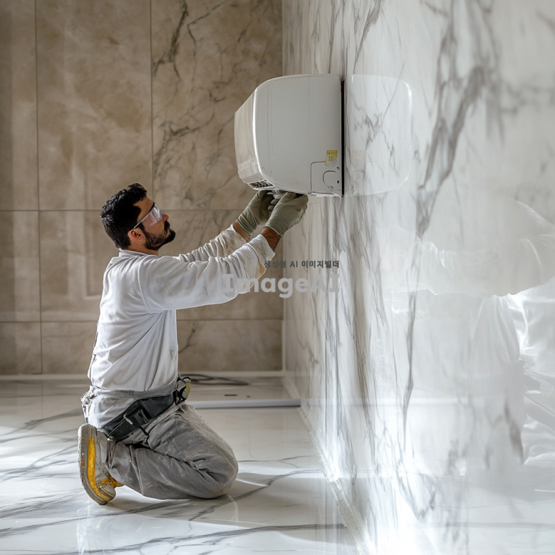 대리석 바닥을 보수하는 장인, 대리석의 광택을 되살리는 과정, 정교한 손길로 대리석의 결함을 보수하는 모습, 고급스럽고 세련된 인테리어