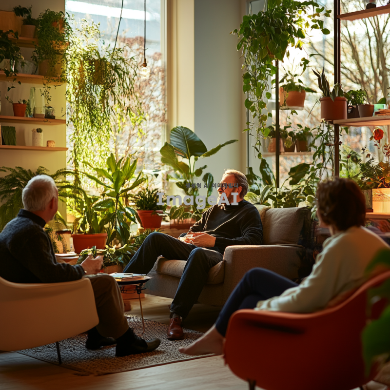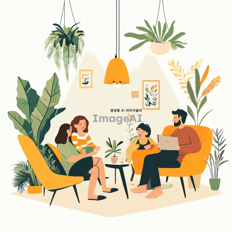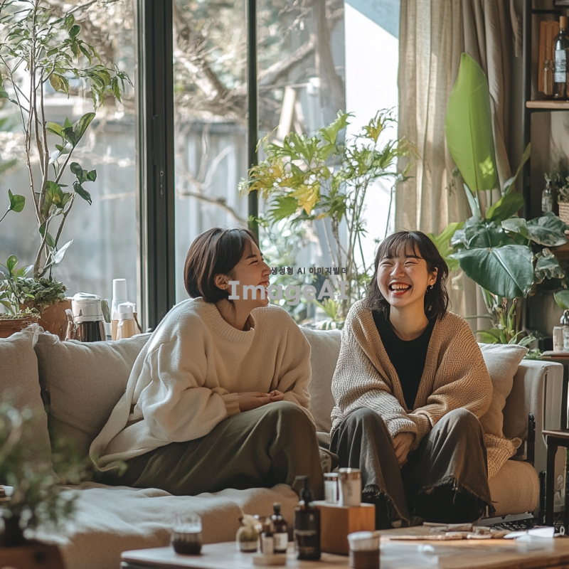 따뜻하고 아늑한 가정 환경에서 편안하게 휴식을 취하는 사람들, 부드러운 조명과 자연스러운 색감, 편안한 가구와 식물들이 조화를 이루는 실내 공간, 가족과 함께 웃으며 대화하는 장면, 현대적이면서도 친근한 느낌의 홈케어 제품들이 배치된 장면, 건강과 웰빙을 강조하는 분위기.
