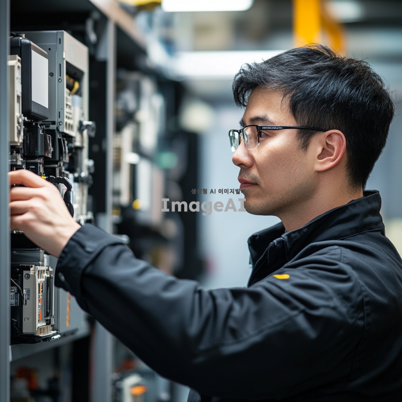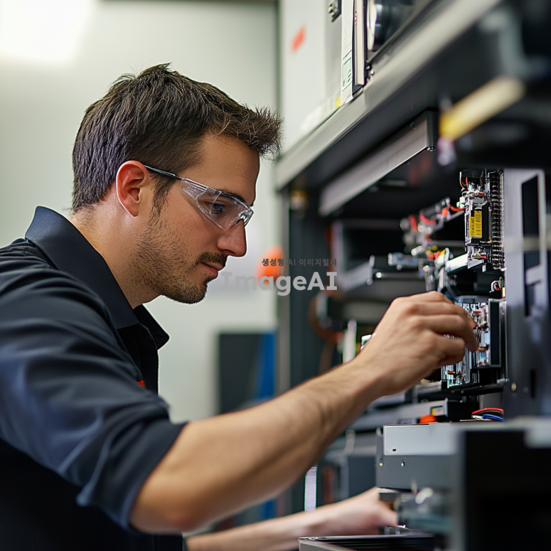최신 가전제품을 전문적으로 관리하는 기술자, 현대적인 작업 공간에서 세심하게 가전제품을 점검하고 있는 모습, 깔끔하고 조직적인 작업 환경, 첨단 도구와 장비, 전문적인 분위기, 밝고 환한 조명, 기술자의 집중된 표정과 디테일한 작업 과정, 가전제품의 정밀한 부품들이 돋보이는 장면.