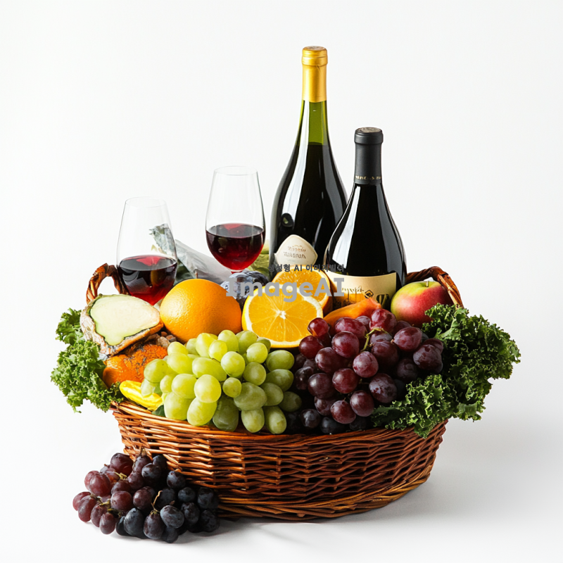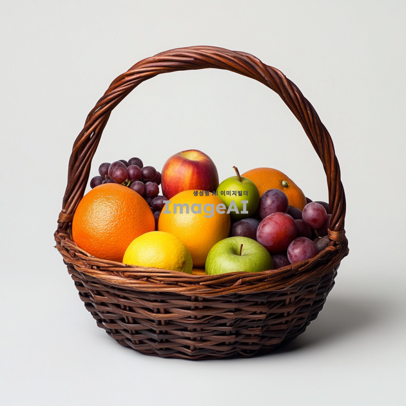 흰색 배경 위에 놓인 단일 물체, 고해상도, 선명한 디테일, 그림자 최소화, 자연광 사용, 물체의 모든 면이 잘 보이도록 중앙에 배치, 물체의 본래 색상이 잘 드러나도록 조명 조절.바구니와 바구니에담긴것들을 제외하고 배경 전부제거