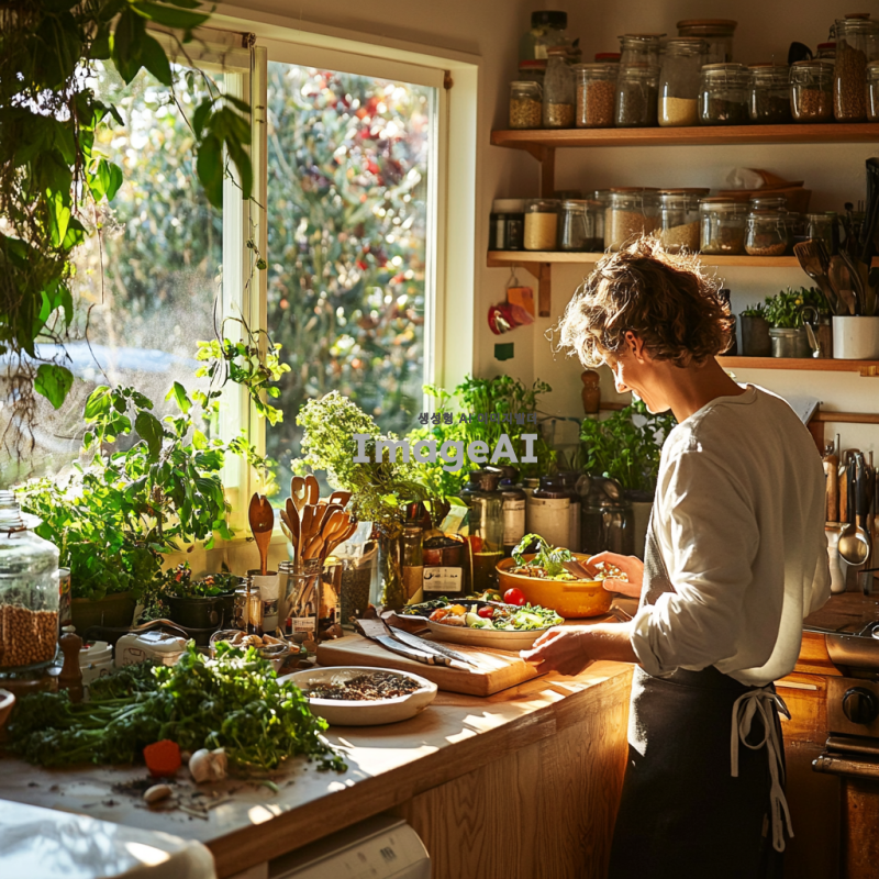 따뜻한 주방에서 요리하는 중인 사람, 신선한 재료들이 가득한 조리대, 밝고 환한 조명 아래에서 다양한 향신료와 허브를 사용하여 요리를 준비하는 모습, 주방 도구들이 깔끔하게 정리된 공간, 활기찬 분위기의 현대적인 주방 인테리어, 요리에 집중하는 모습, 행복한 표정, 창문을 통해 들어오는 자연광, 요리의 향기가 가득한 공간.