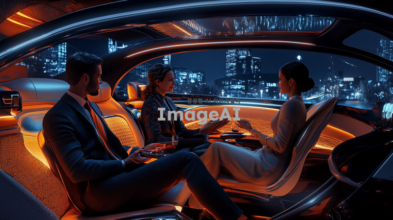 세련된 자동차 내부, 세 명의 남성과 여성이 편안하게 앉아 있는 모습, 자연스럽고 즐거운 대화 나누는 장면, 현대적인 의상과 스타일, 차창 밖으로 보이는 도시 풍경, 따뜻한 조명과 고급스러운 분위기.