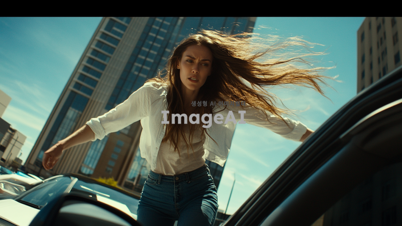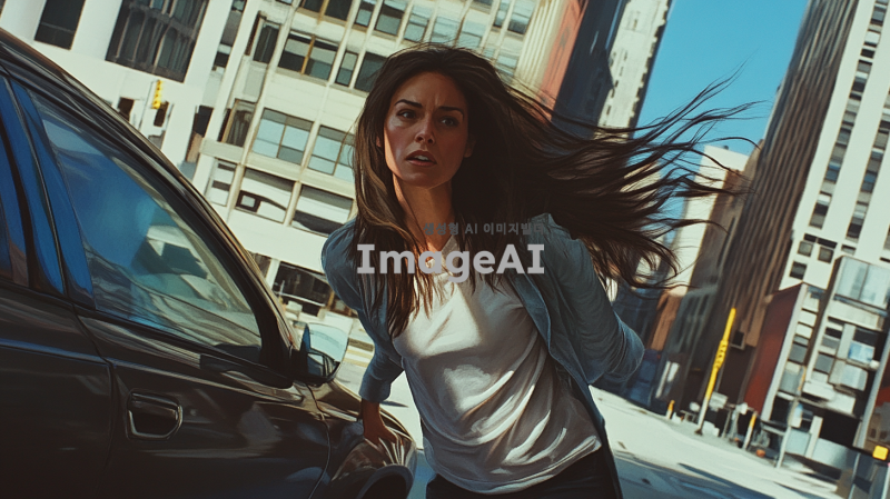 도심의 주차장에서 차 문을 열고 서둘러 나오는 여성, 긴 머리가 바람에 흩날리며, 캐주얼한 옷차림, 주변에 고층 빌딩들이 보이는 배경, 긴장된 표정과 빠른 동작이 강조된 장면, 일상적인 도시의 분위기와 조화롭게 어우러진 색감.