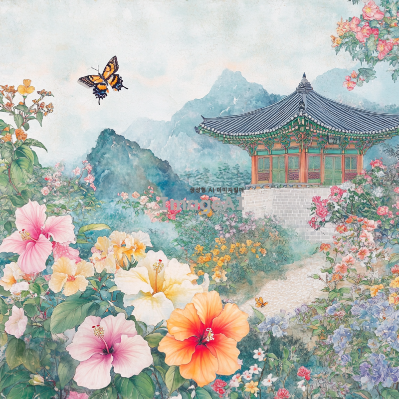 무궁화가 만개한 아름다운 정원을 배경으로, 햇살이 부드럽게 내리쬐는 아침 풍경. 다양한 색상의 무궁화가 조화롭게 어우러져 있으며, 나비와 벌들이 꽃 주변을 날아다니는 모습. 한국 전통 정원의 정취가 느껴지는 섬세한 디테일 강조.