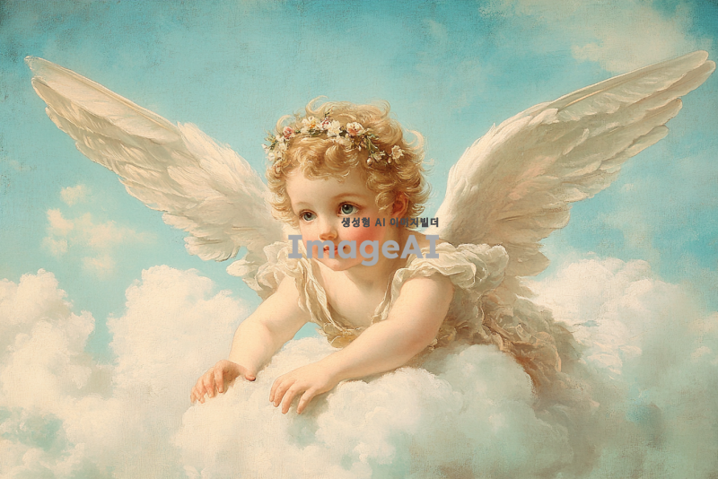 천사 같은 날개를 가진 사랑의 신 큐피트, 장난기 넘치는 표정, 하늘을 나는 장면, 부드러운 파스텔 색조의 배경, 고전적인 예술 스타일, 로맨틱하고 환상적인 분위기,구름 아래를 보는 큐피트.