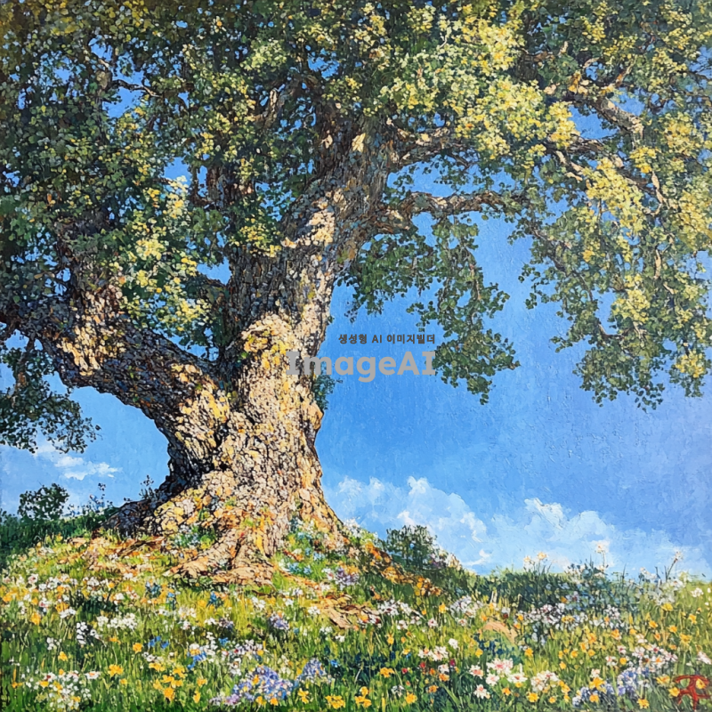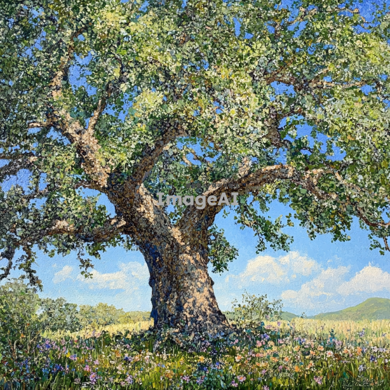푸른 하늘 아래 서 있는 거대한 참나무, 햇빛이 나뭇잎 사이로 비쳐 아름다운 그림자를 만드는 모습, 나무 주위에는 작은 야생화들이 피어 있고, 나무의 질감과 나뭇잎의 세밀함이 잘 드러나도록 표현, 평화롭고 자연적인 분위기, 고요한 숲 속의 느낌.